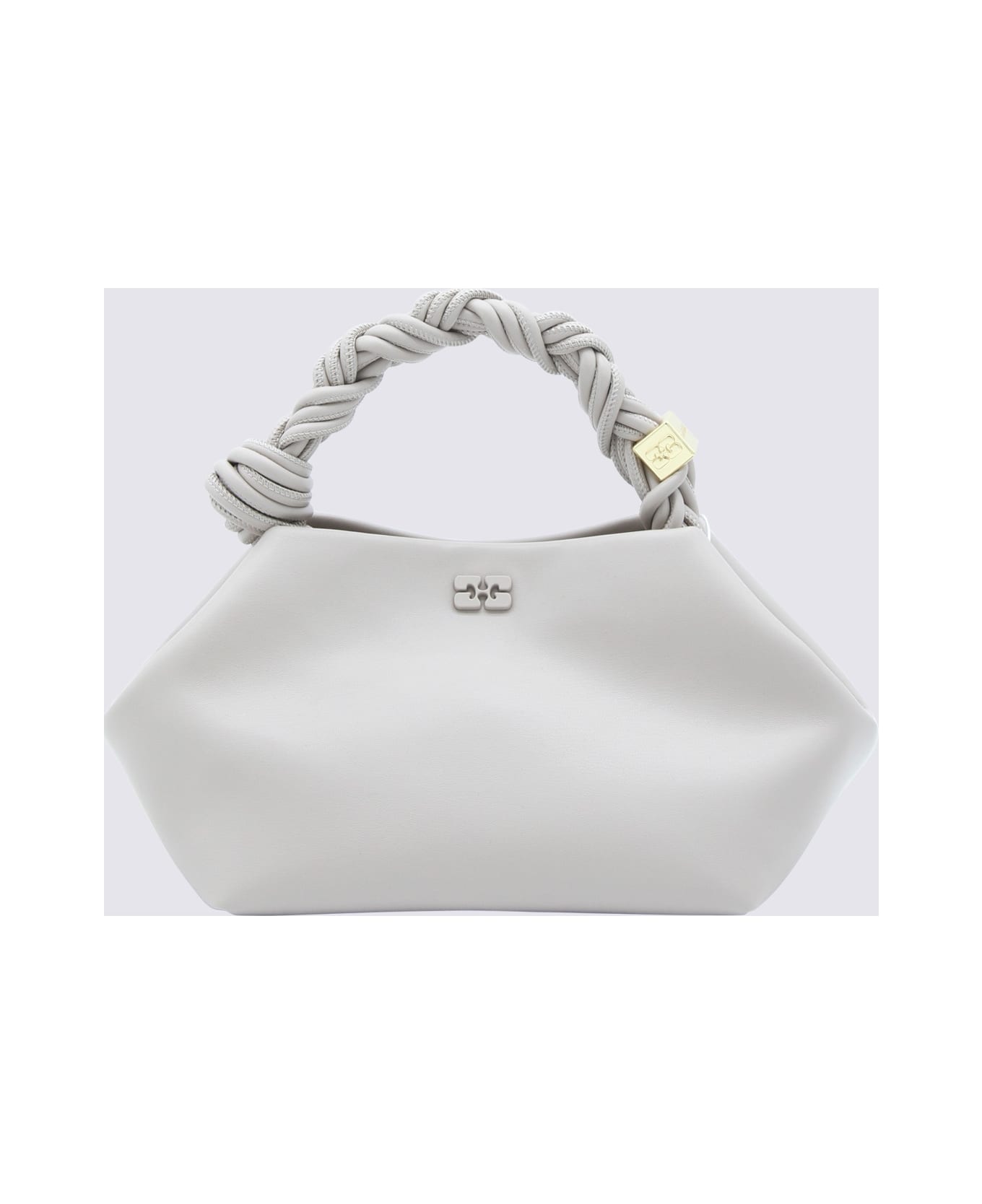 Oyster grey Bou small top handle bag from Ganni featuring main compartment, gold tone metal finishes, braided handle, adjustable and detachable shoulder strap, magnetic closure and tone-on-tone logo details.