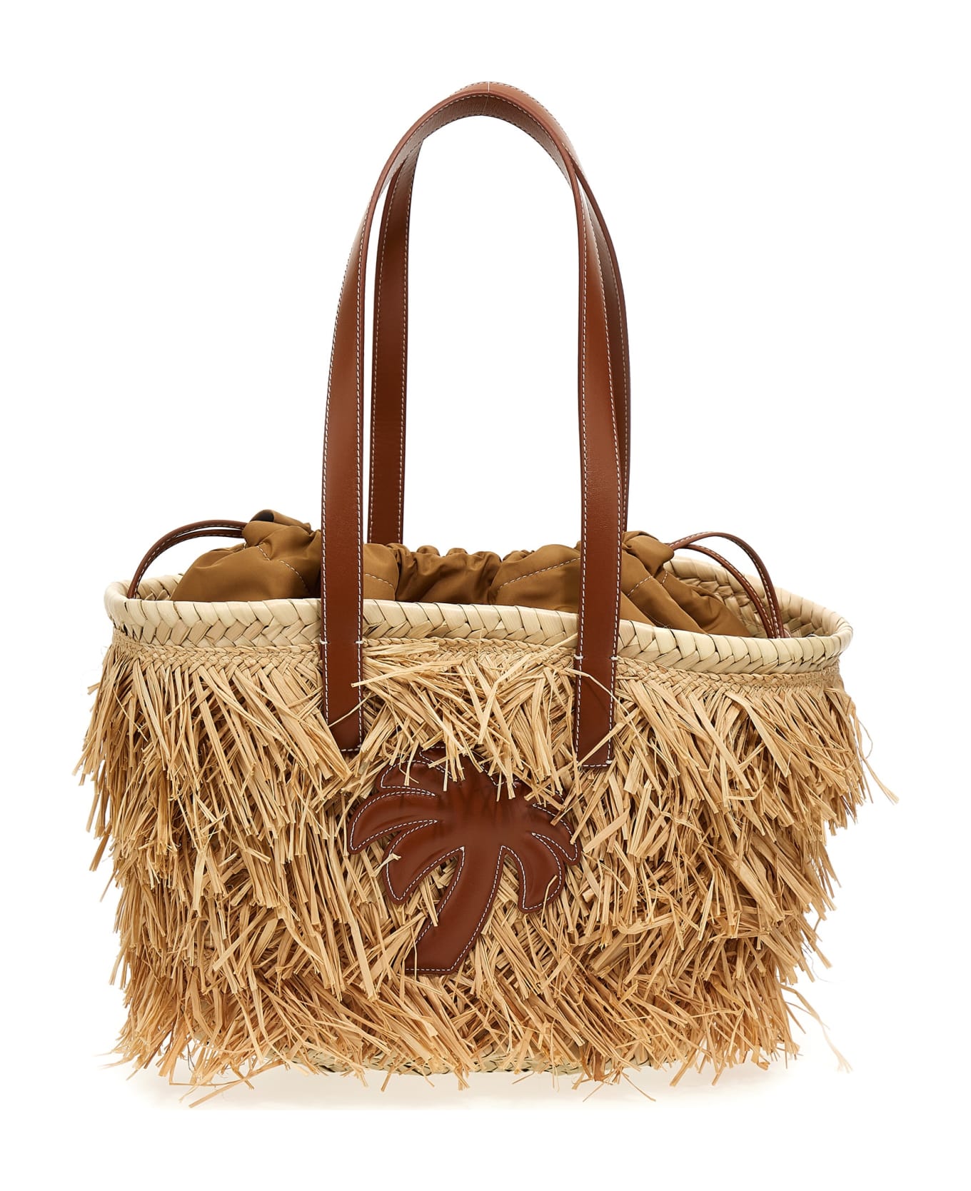 Palm Basket shopper bag in raffia with double leather handles, leather logo patch on the front, and removable inner pouch with drawstring closure. Composition: