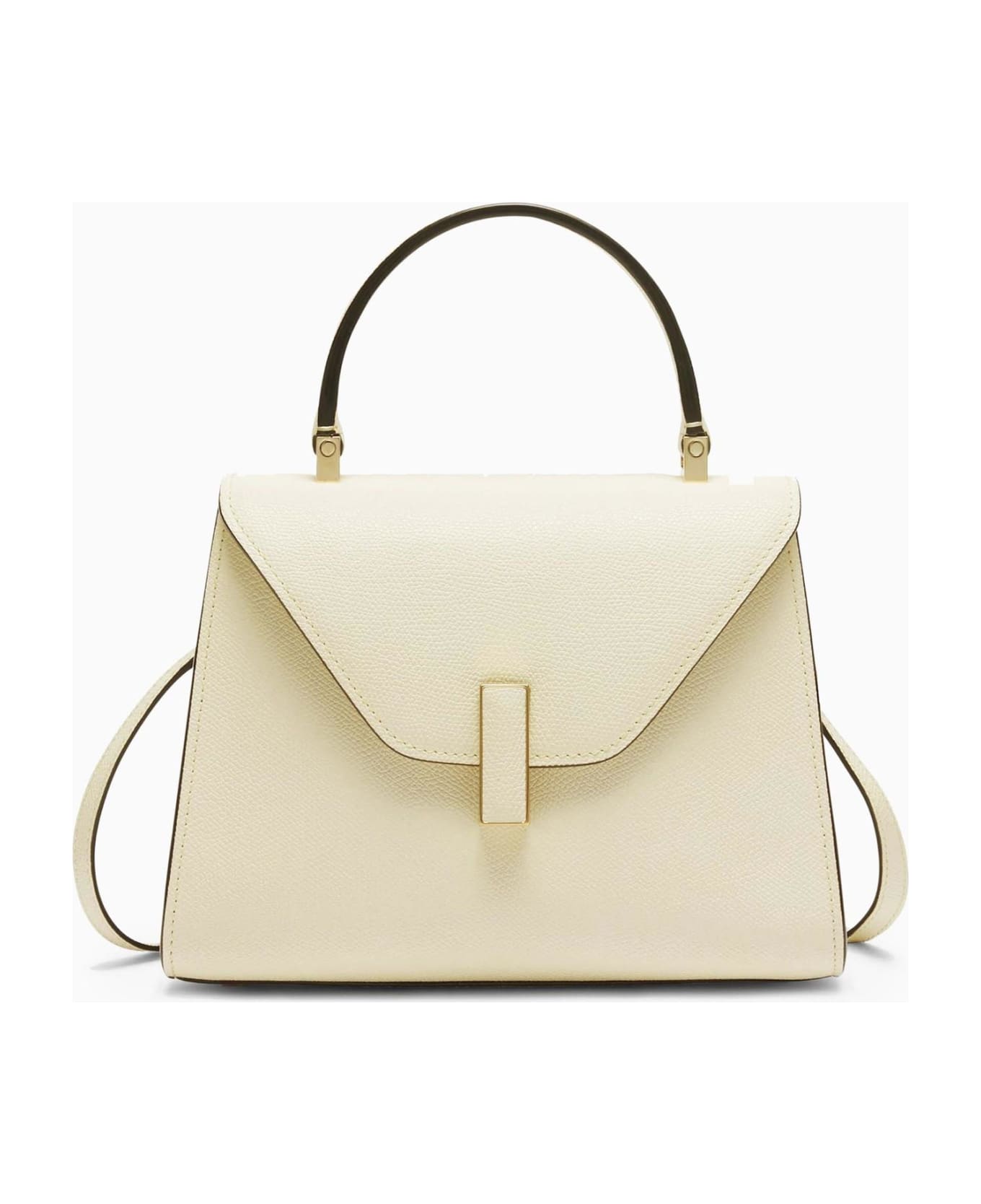 Mini shoulder bag by Valextra in parchment white calfskin, featuring a top handle, a removable and adjustable shoulder strap, a gold-tone metal clasp, a single compartment and an internal flat pocket.