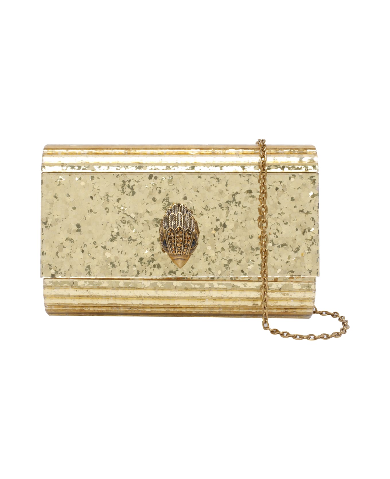 Kurt Geiger gold Party Eagle clutch, magnetic closure, inner slot, chain removable strap, frontal logo Composition: 95% Acrylic, 5% Metal