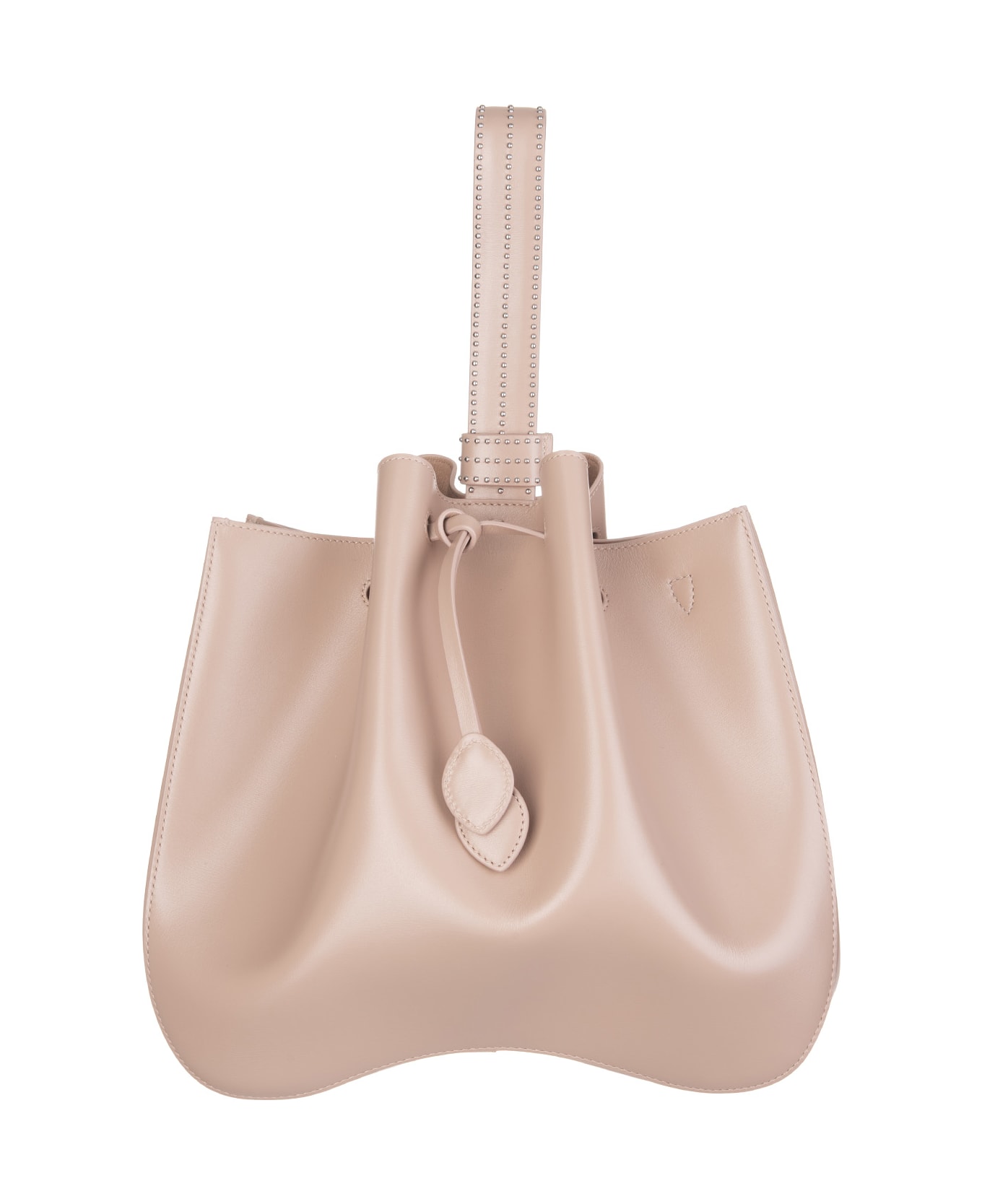 Alaia medium Rose Marie wrist bag made of pinkish beige smooth leather and finished with silver galvanized micro-studs applied along the handle profiles. Model characterized by a padded handle, a single internal compartment, a drawstring detail with tassels and an optimized closure system thanks to a press button.