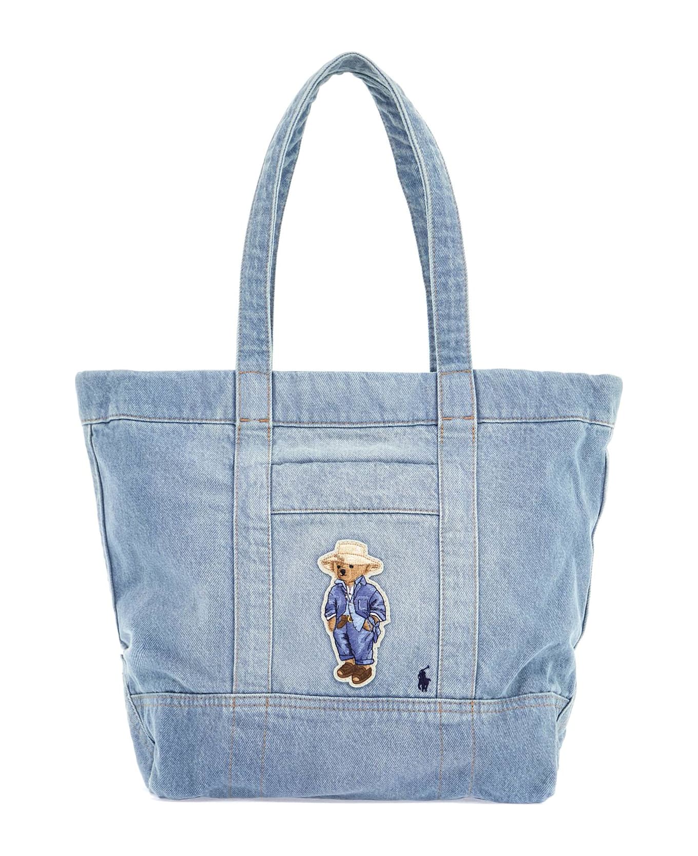 This Polo Ralph Lauren tote bag is made of cotton denim and features an embroidered Polo Bear and pony. It has a zip closure, an unlined interior with an open pocket, and an additional slit pocket on the front.