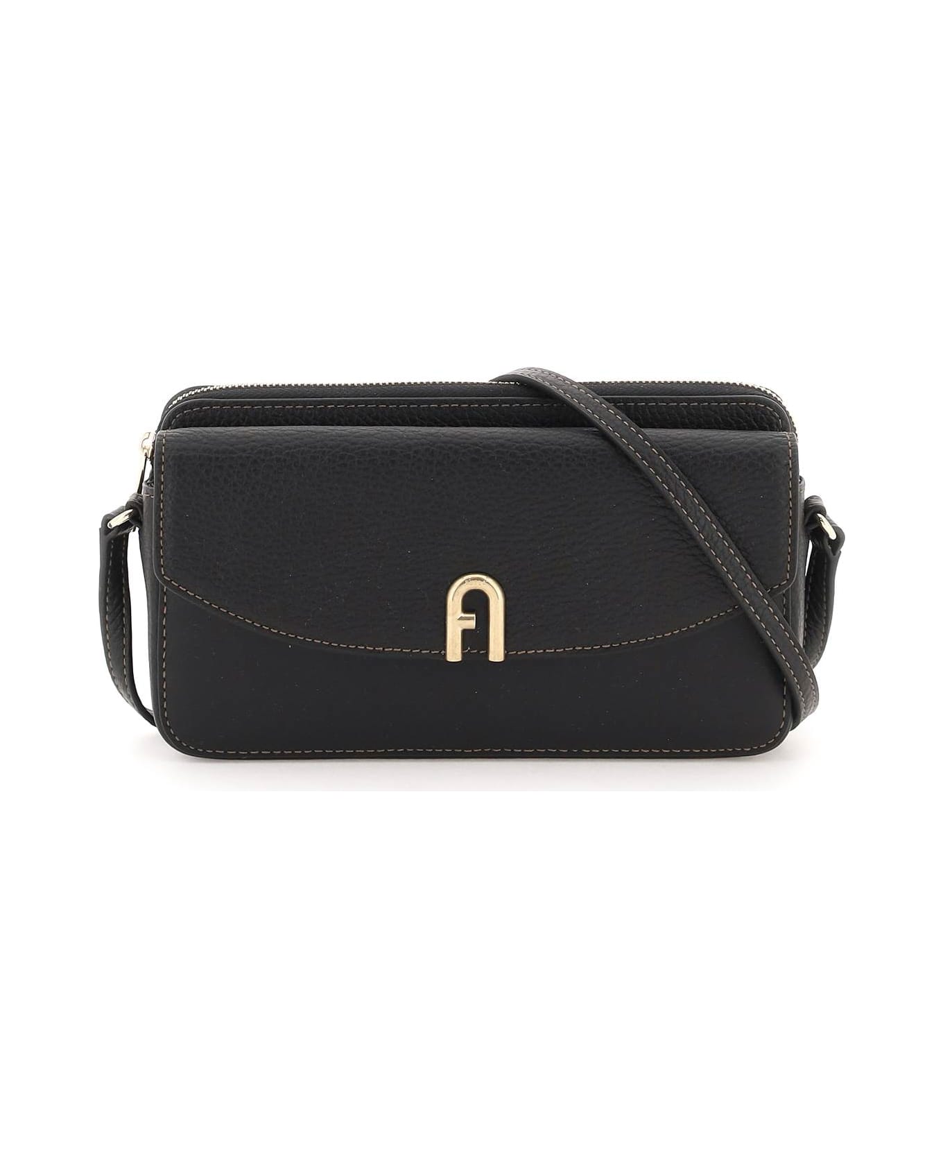 "Primula" mini bag by Furla crafted in smooth and grained leather with iconic metal Arco on the flap. Magnetic closure and lined interior and a zippered rear pocket. Adjustable shoulder strap and gold-finished metalware.