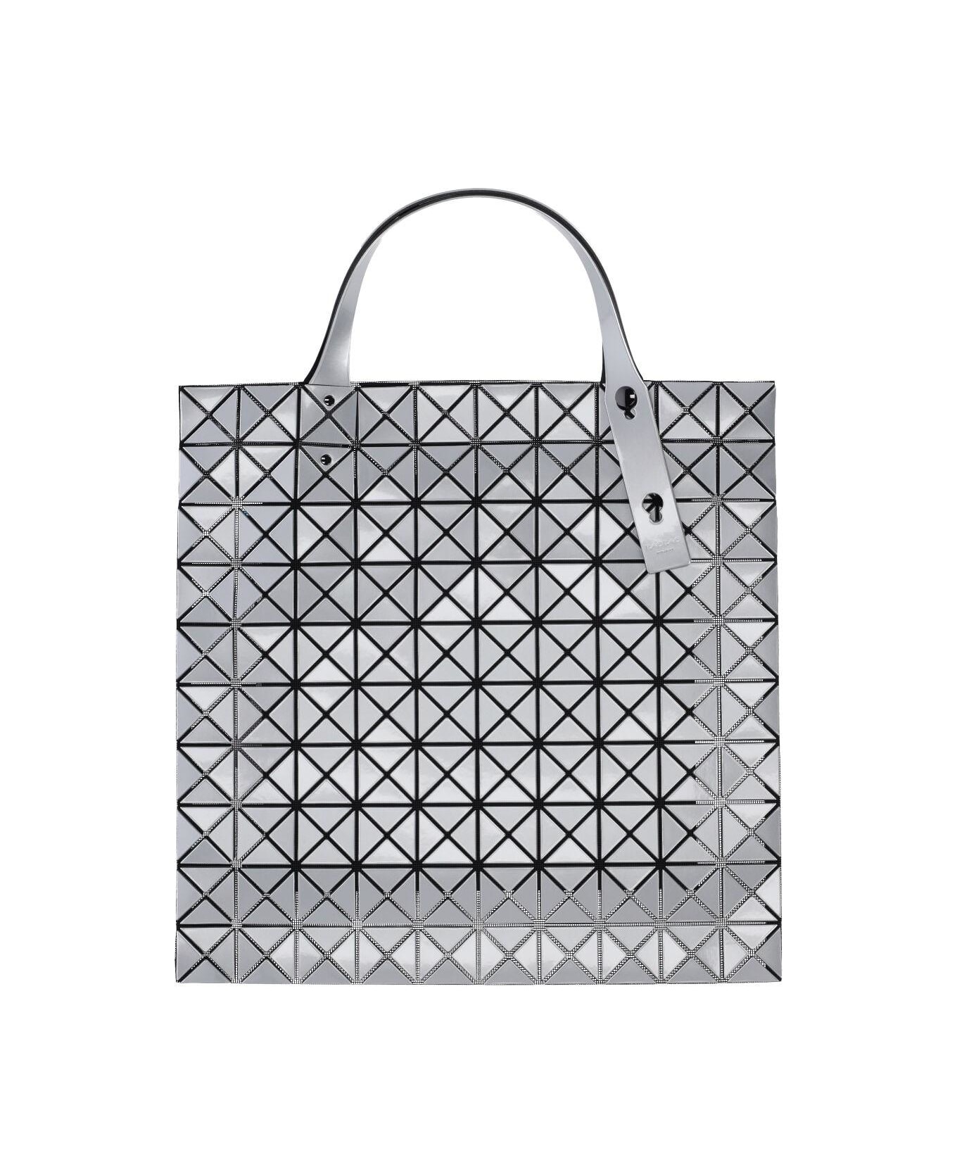 Bao Bao Prism large tote bag in silver P. V. C. with panel design, two adjustable handles, interior zipper pocket, and main interior compartment.