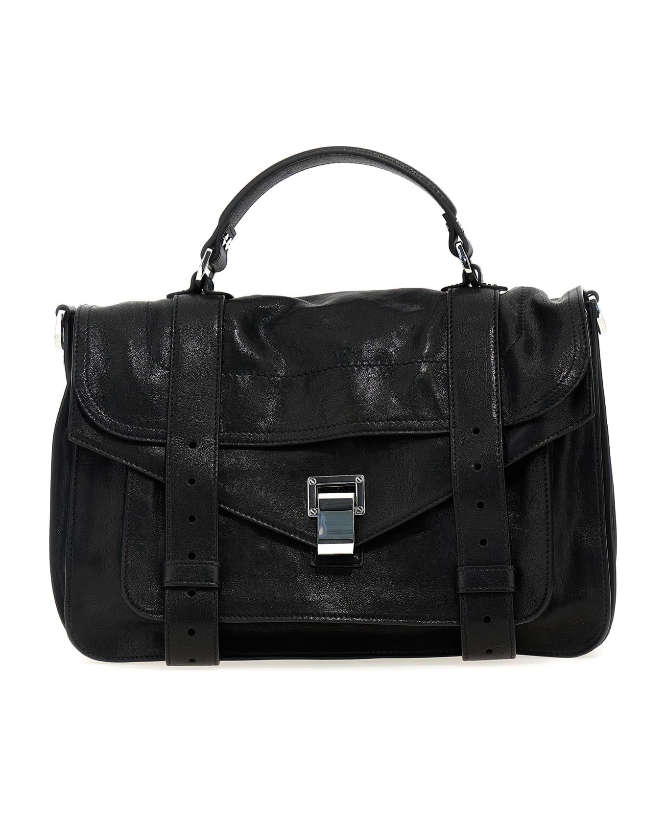 PS1 Medium Bag' leather handbag with metal hook closure and adjustable straps, exterior zip pocket, interior pockets, fixed top handle, and removable shoulder strap.