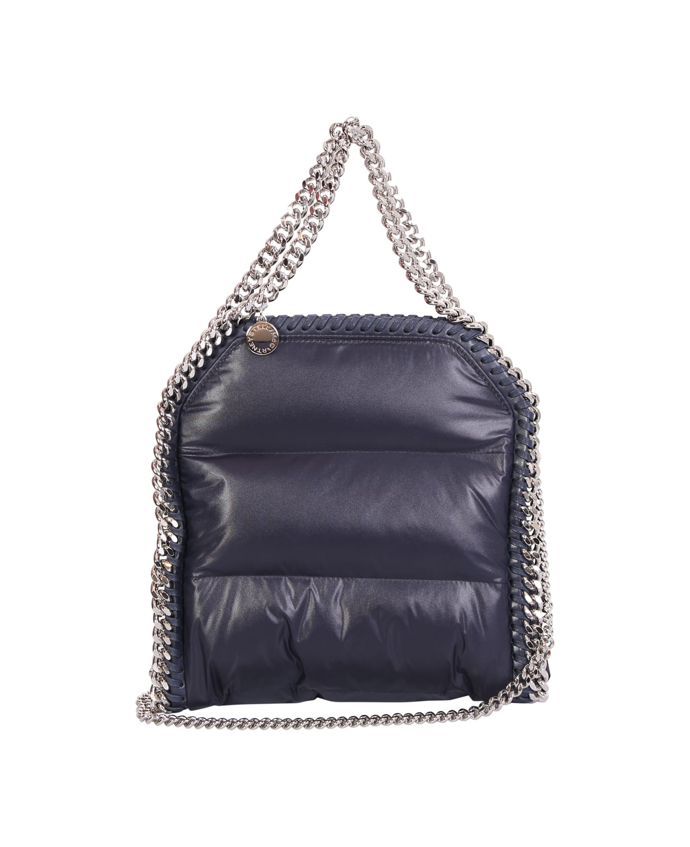 Top press stud fastening. Main compartment. Internal slip pocket. Two top handle. Chain link shoulder strap. Logo charm. Quilted. Padded design. Diamond-effect chain. Color: navy blue