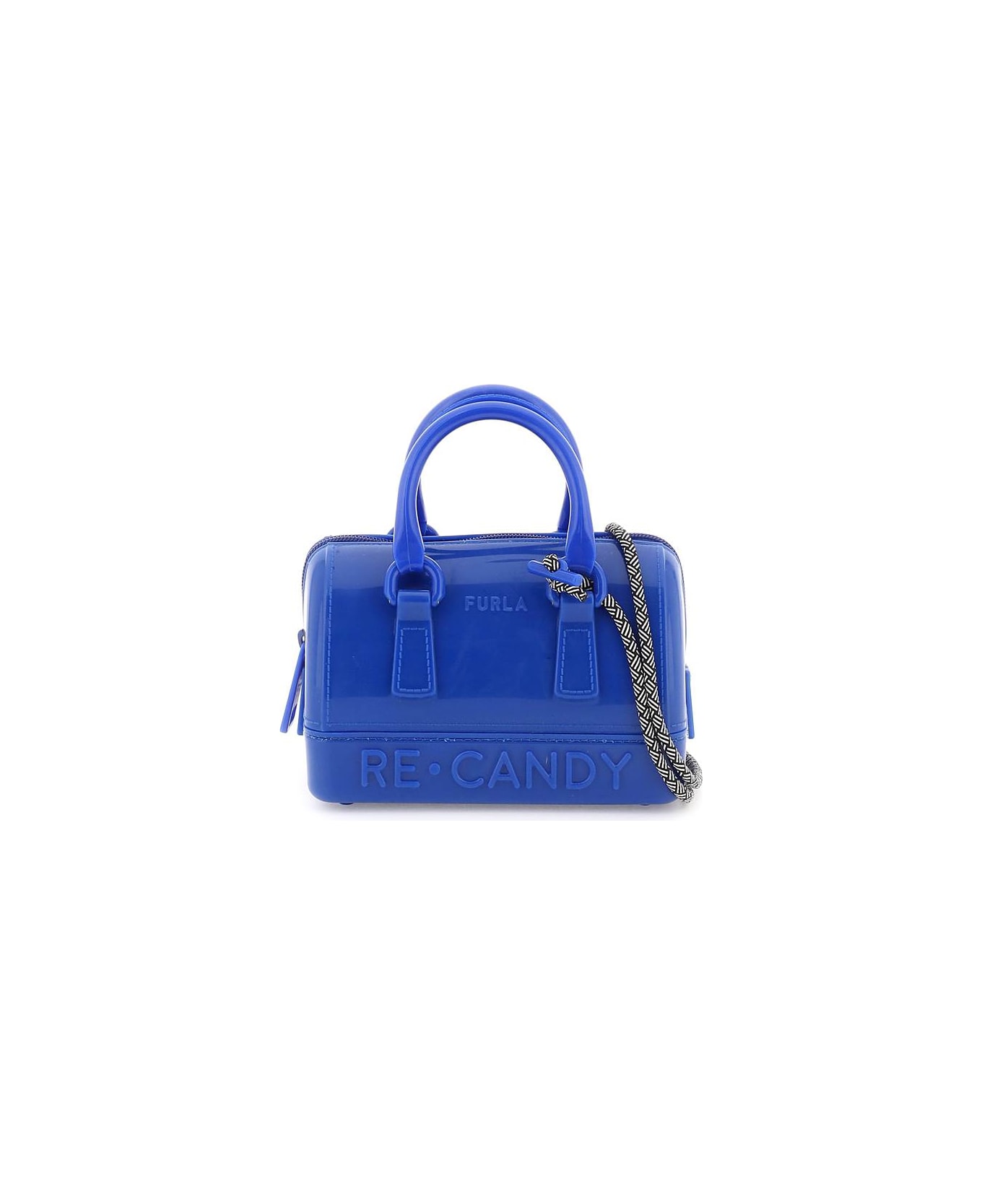 Candy mini bag by Furla crafted in recycled TPU with embossed "RE-CANDY" lettering on front and back, double top handle with tone-on-tone recycled ABS details and zip closure. Detachable trekking-like strap. Embossed lettering logo on front and on the zip puller. Unlined.