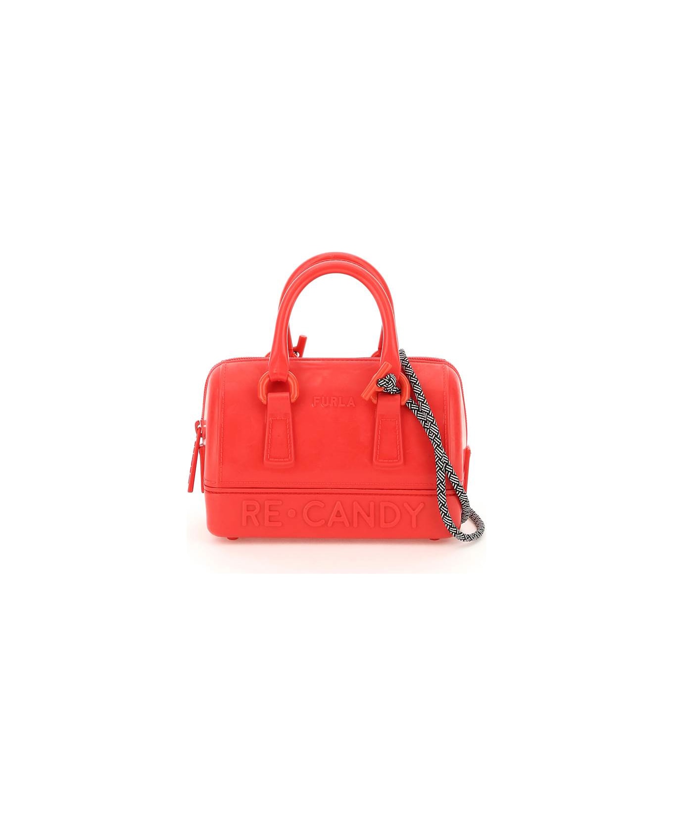 Candy mini bag by Furla crafted in recycled TPU with embossed "RE-CANDY" lettering on front and back, double top handle with tone-on-tone recycled ABS details and zip closure. Detachable trekking-like strap. Embossed lettering logo on front and on the zip puller. Unlined.