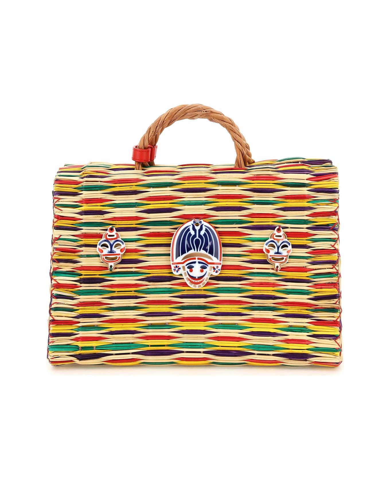 Chito bag by HEIMAT ATLANTICA crafted in hand-woven reed and enriched with porcelain fetishes from Sargadelos applied on front. Reed top handles connected with a leather strap with press-stud, unlined interior with leather base, gold-finished metal protective feet.