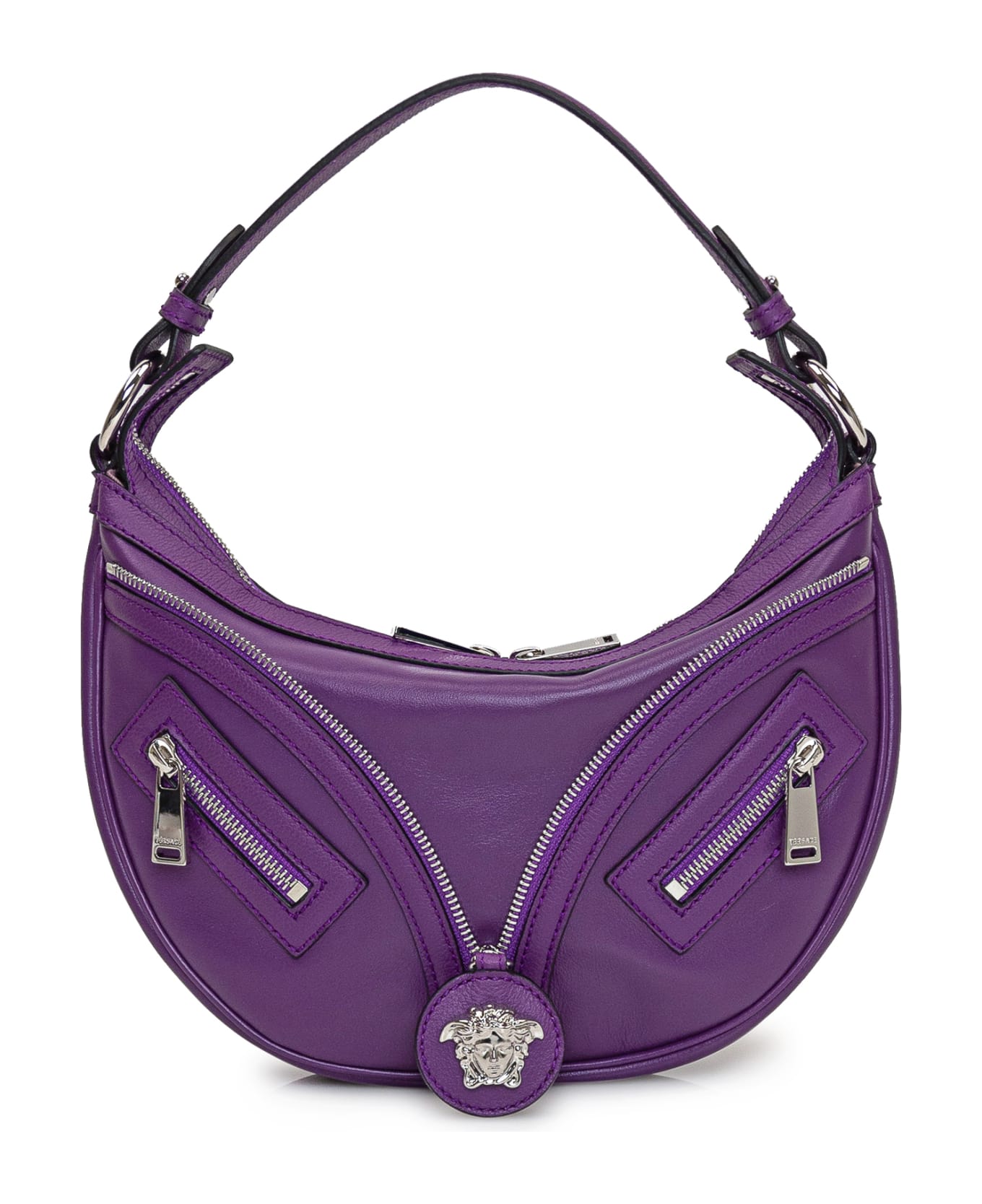 Purple shoulder bag. Removable handle. Adjustable and removable shoulder strap. Zip closure. Zip and Medusa on the front. Logo on the back. Composition: Outside:, 100% Calfskin Lining:, 100% Cotton