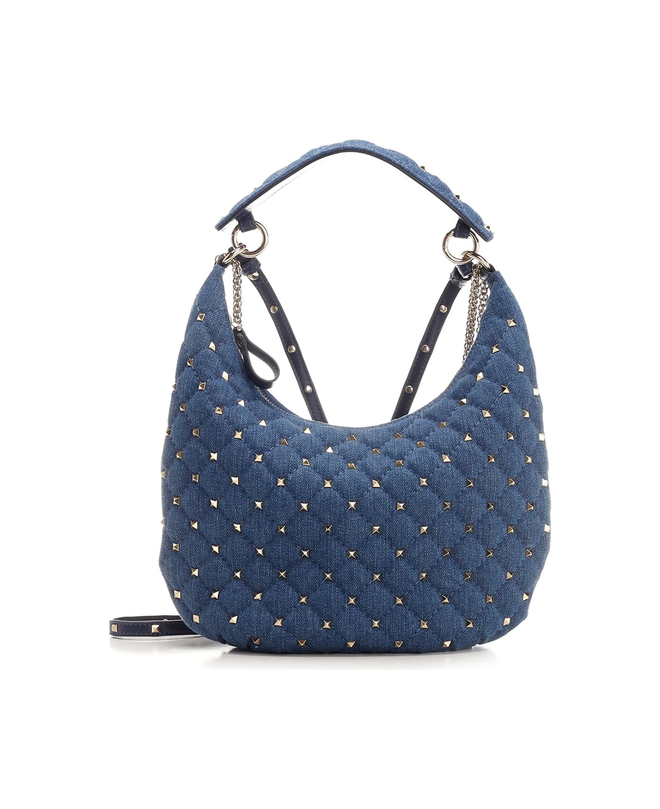 "Rockstud Spike" hobo bag from Valentino Garavani, in blue denim with gold-finish studs, zip closure, internal side pocket, sliding chain shoulder strap, short handle, leather shoulder strap. Composition: I 98%COTTON 02%ELASTODIENE