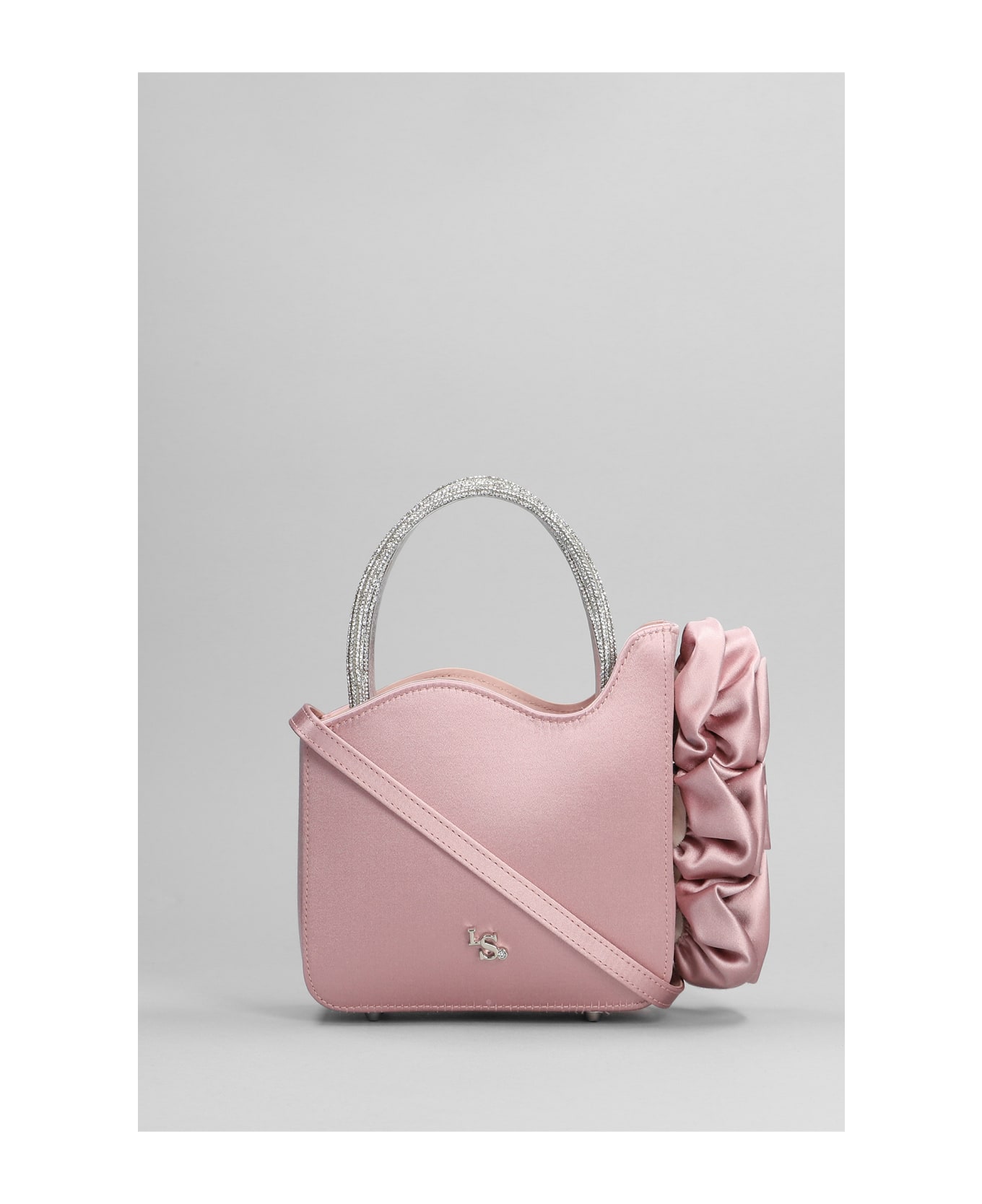 Rose Hand bag in rose-pink satin, detachable shoulder strap, double handle, flower decoration, cristal details, 100% satin, Made in Italy, Height 150 mm, Width 140 mm