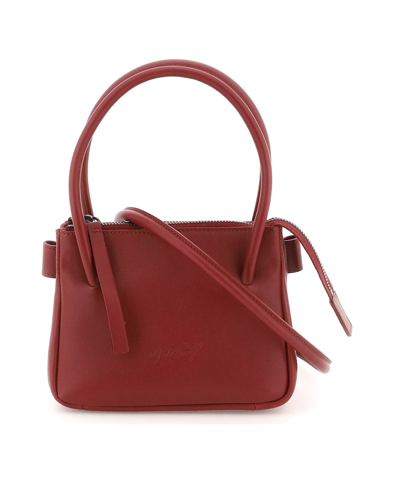 Sacco Piccolo mini bag by Marsèll handcrafted in soft calf leather with debossed logo on front, tubular top handles and sliding shoulder strap with side knots. Zip closure, magnetic gusseted sides and leather lining. Antiquated ruthenium-finished metalware.