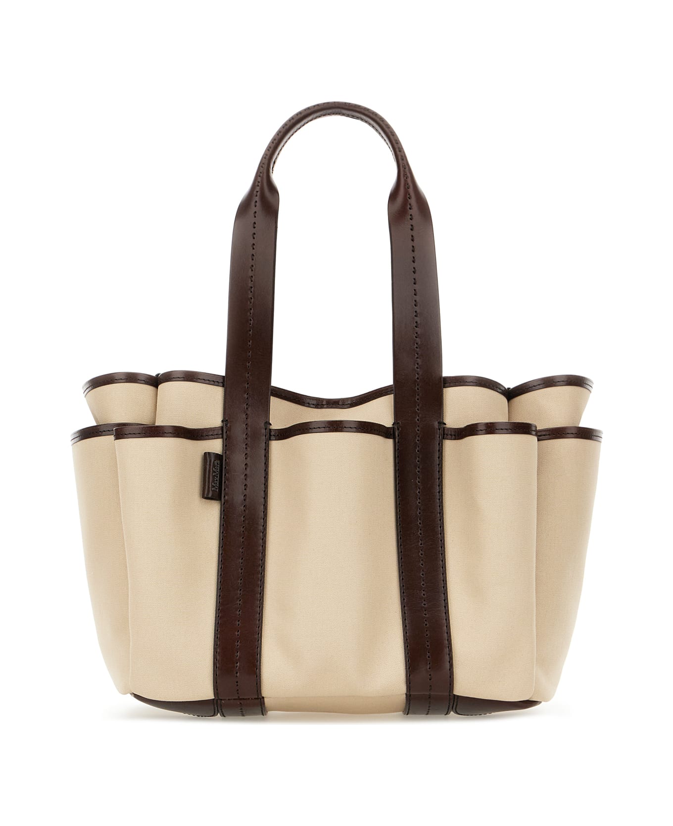 Handbag realized in pure cotton canvas with contrasting leather inserts on the trimming enriched by contrasting logoed leather label at the front. -Contrasting leather flat handles -Hook closure -Eight slit pockets on the entire surface -Lined interior