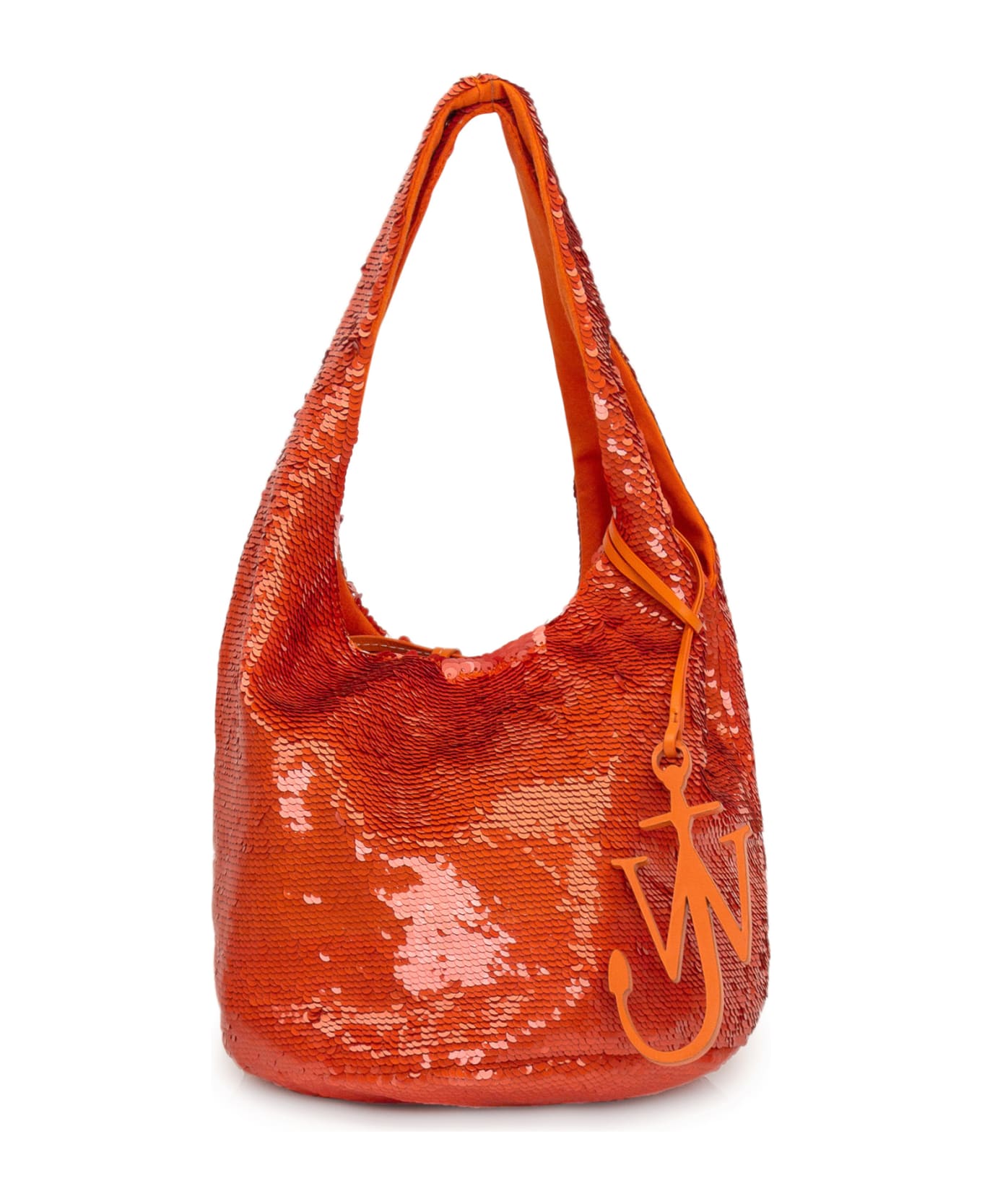 Orange bag. Two handles. Closure with laces. Pendant with logo. All-over sequins.