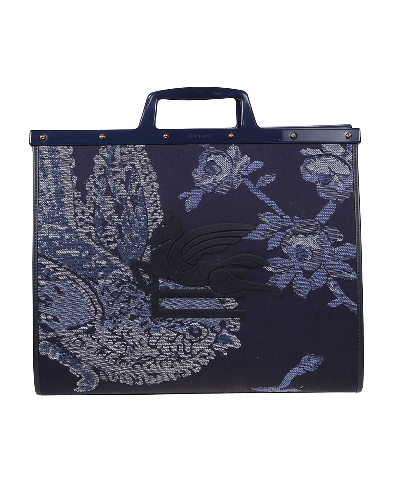 Love Trotter shopping bag made in BY ETRO jacquard fabric. Contrasting inner lining in striped jacquard fabric; embroidered plastic handles. Print with bird and flower detail; decorated with the ETRO Pegaso logo embroidered with a three-dimensional effect.