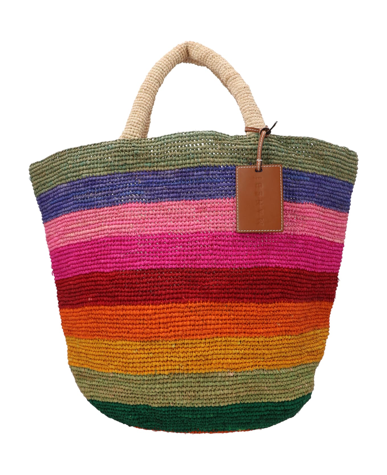 Summer Bag' multicolor striped straw shopping bag with double handle, a leather logo tag.