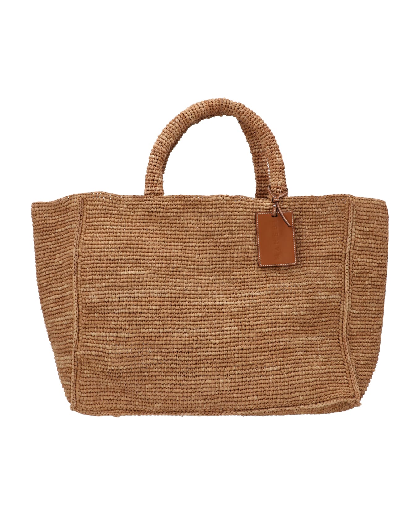 Sunset Bag' straw shopping bag with double handle and a leather logo tag.