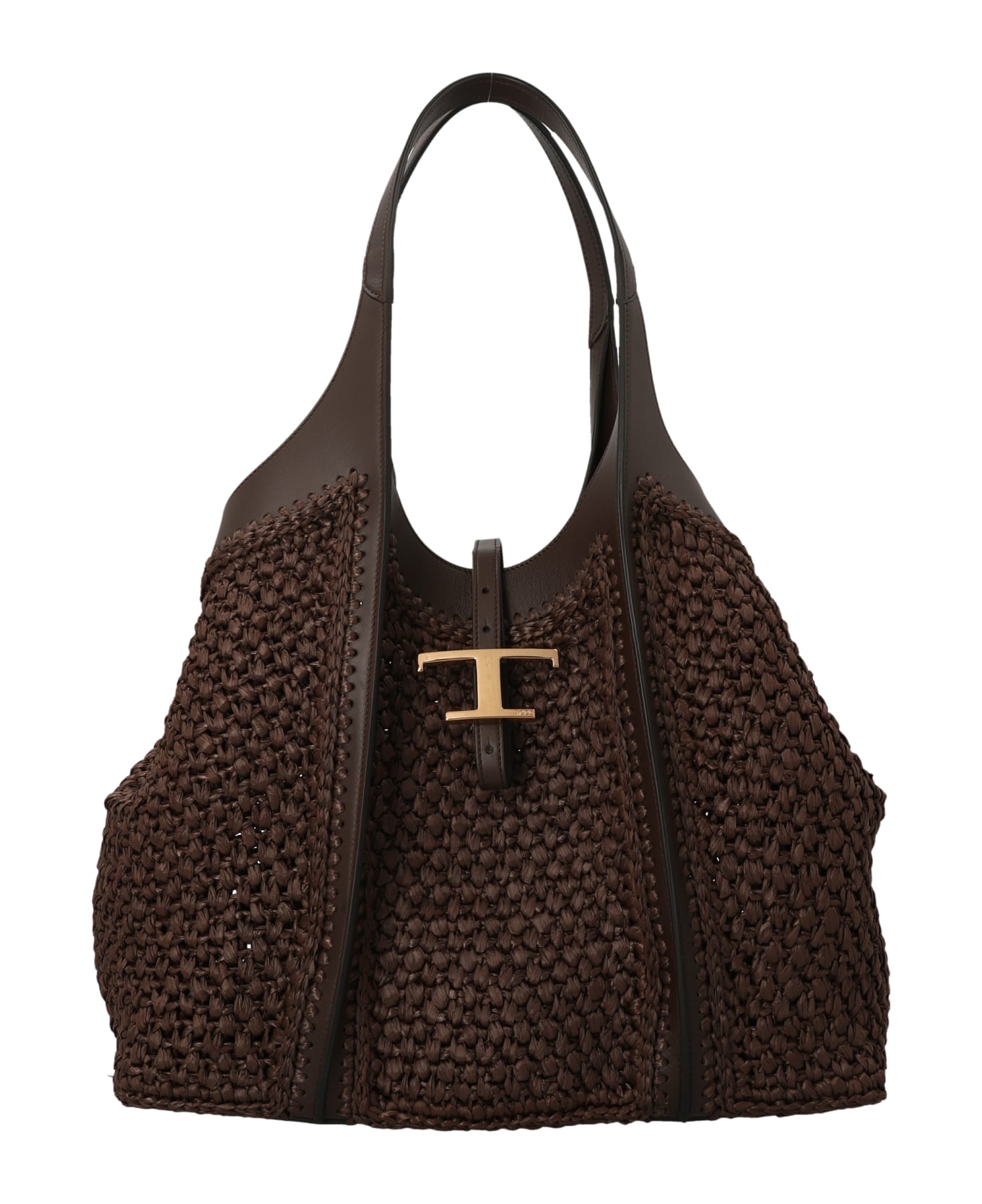 T Timeless' Raffia Shopping Bag With Leather Inserts, T Timeless Metal Pendant Accessory, Band And Snap Button Closure, Leather Handles And A Removable Leather Clutch Bag With Zip Closure. composition: