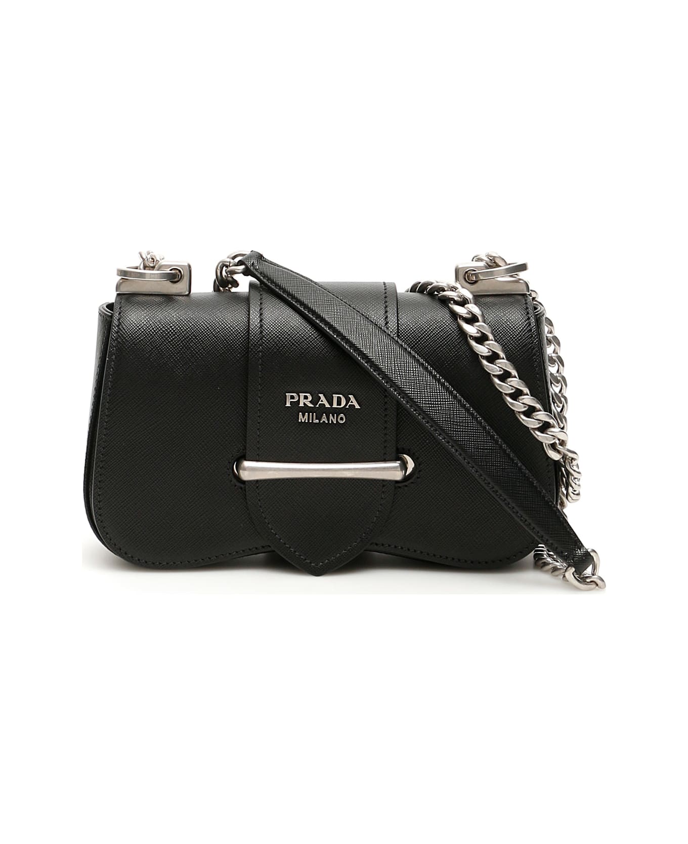 Prada saffiano calfskin mini bag featuring a sliding chain strap with leather insert. Flap with tongue, metallic loop and logo. Logo twill lining, inside leather pocket, silver-tone hardware. Composition: 100% vitello