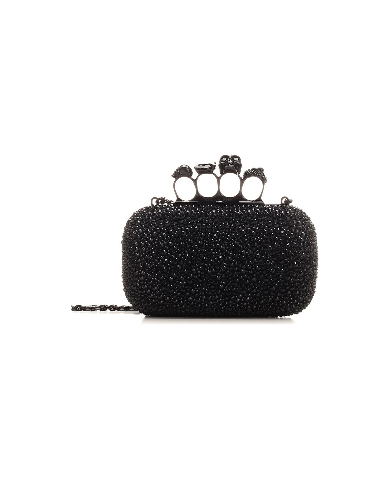 "The Knuckle" clutch in total black from Alexander McQueen, with rigid leather structure entirely covered with black crystals, with long shoulder strap and Swarovski crystals embellished rings handle. Composition: calf leather
