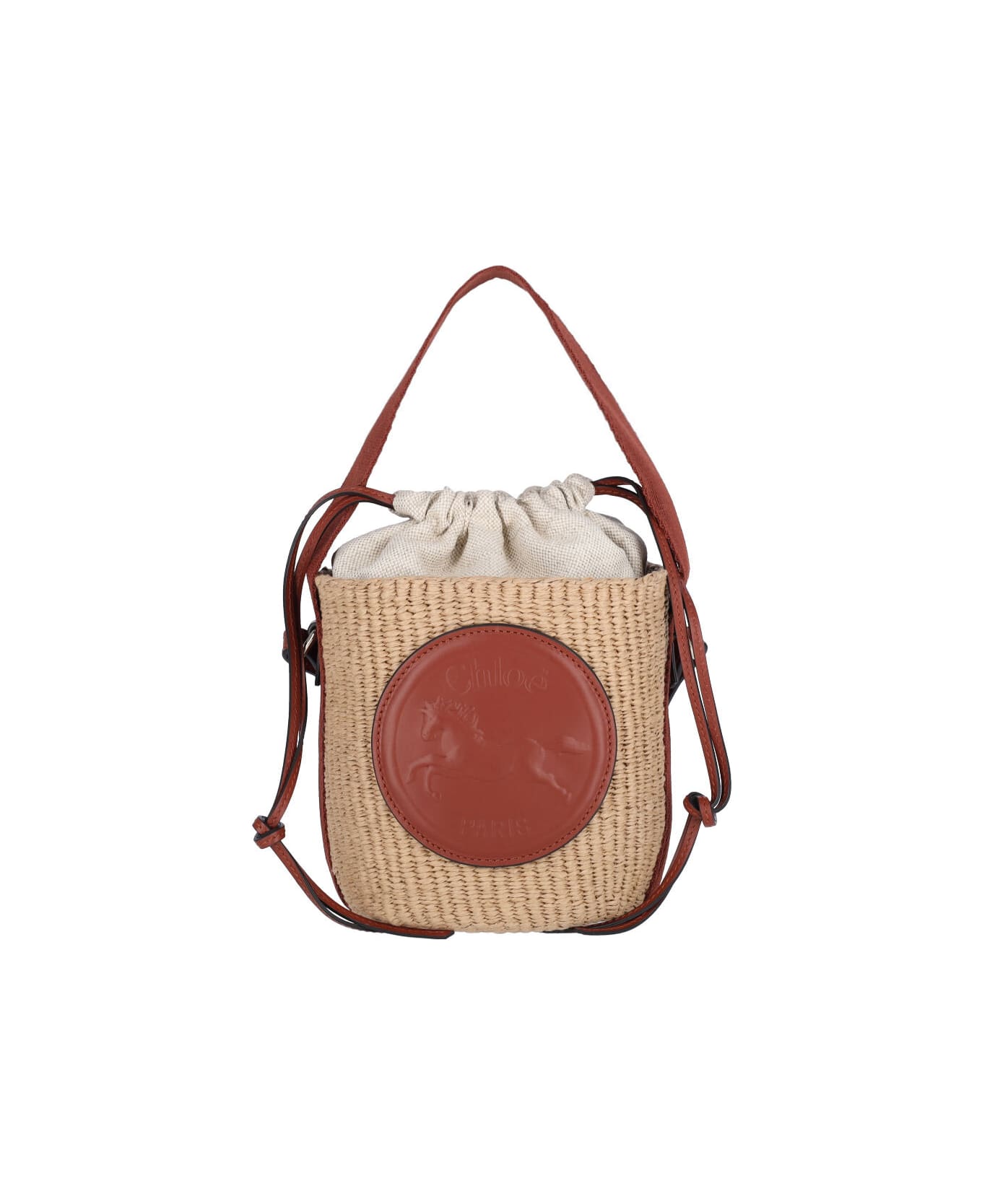 Chloe Horse Medal small bag, made of beige raffia, one top handle, one adjustable top strap, leather logo applied front, fabric interior, drawstring closure, one inside pocket, one single inside compartment. Composition: 100% Raffia