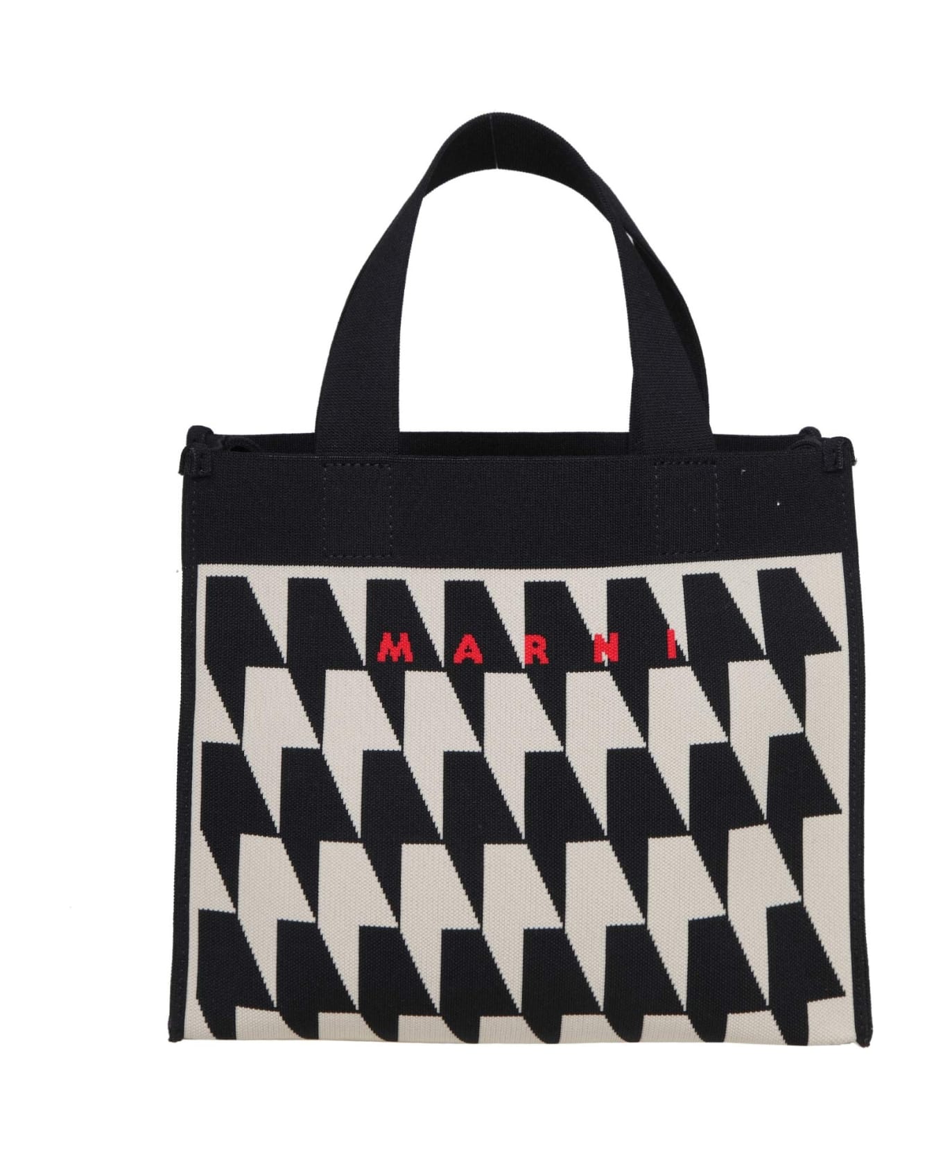 Shopping bag in knitted fabric black and beige colour marni logo on the front adjustable fabric shoulder strap internal slot pocket measures: width 28cm height 24cm depth 11cm composition 100% polyester made in italy