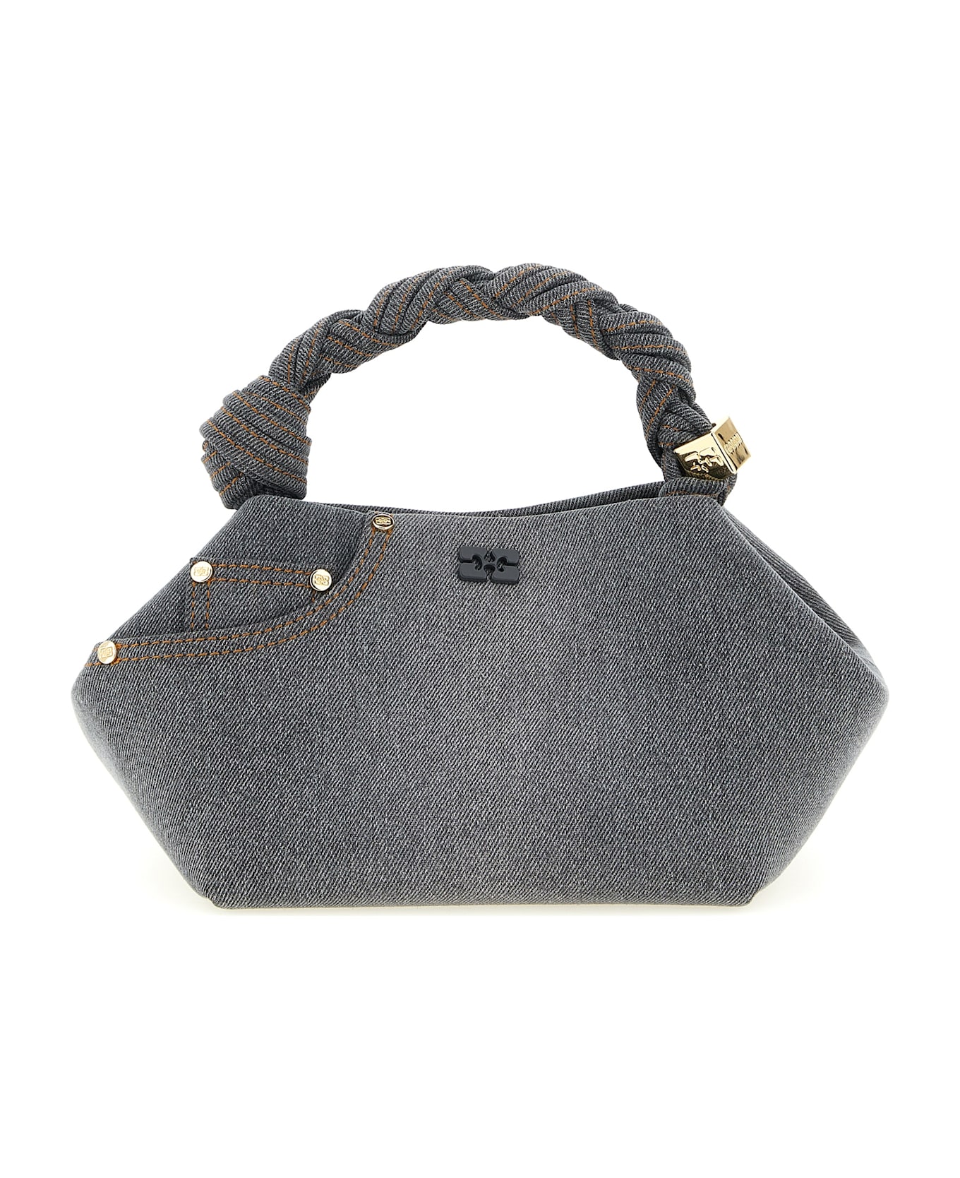 'Small Bou' cotton blend handbag with tonal metal 'GANNI Butterfly' logo on the front, back pocket with logo embroidery, fixed braided handle with knot and a metal nut, inner magnetic closure, adjustable and removable shoulder strap. SUSTAINABLE: Product made with recycled materials.
