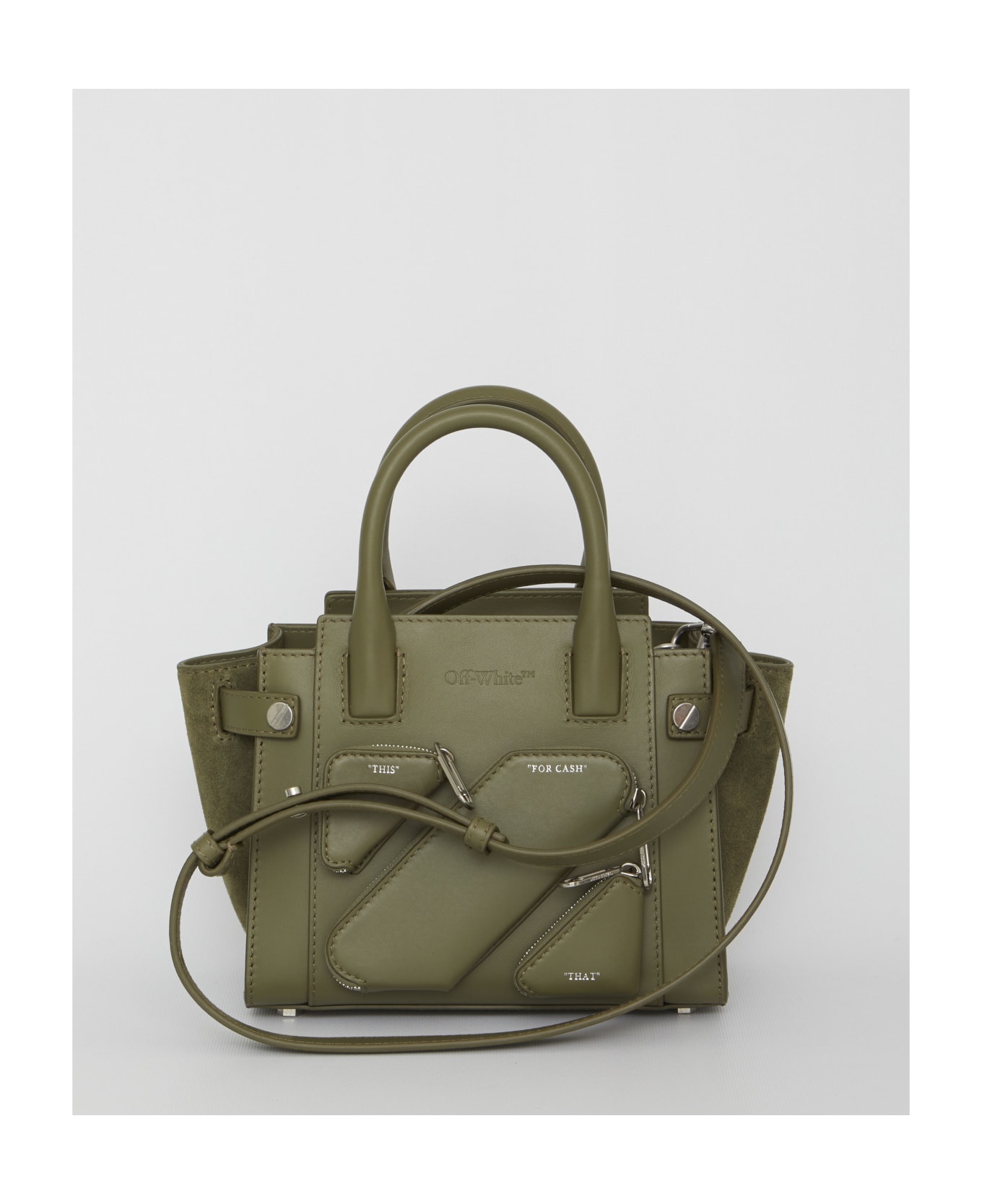 Small City tote bag in military green leather with tone-on-tone suede inserts on both sides. It features fixed top handles, adjustable and detachable shoulder strap, embossed zip pockets on the front, snap-button closure, one main interior compartment and three interior card slots.