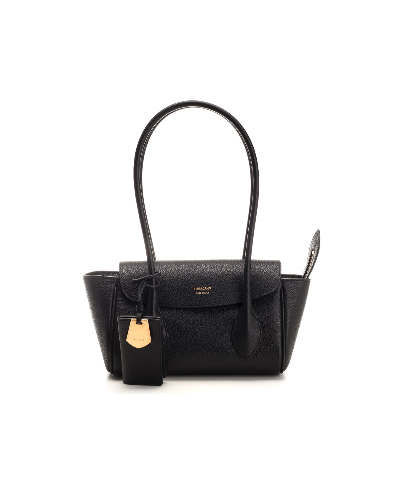 Small 'East-West' tote bag in black hammered calfskin by Ferragamo, with flap closure, two long handles, badge holder charm and golden plaque with signature. Composition: 100%CALF 80%GOAT LINING20%CALF.