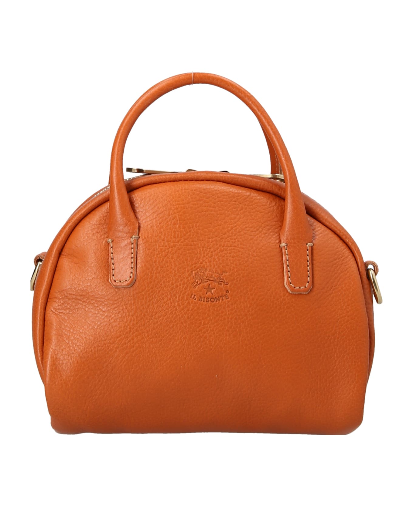 Small handbag in vegetable-tanned tumbled cowhide leather with adjustable and removable shoulder strap with snap hooks, zip closure, cotton cloth lining and embossed logo at the front.
