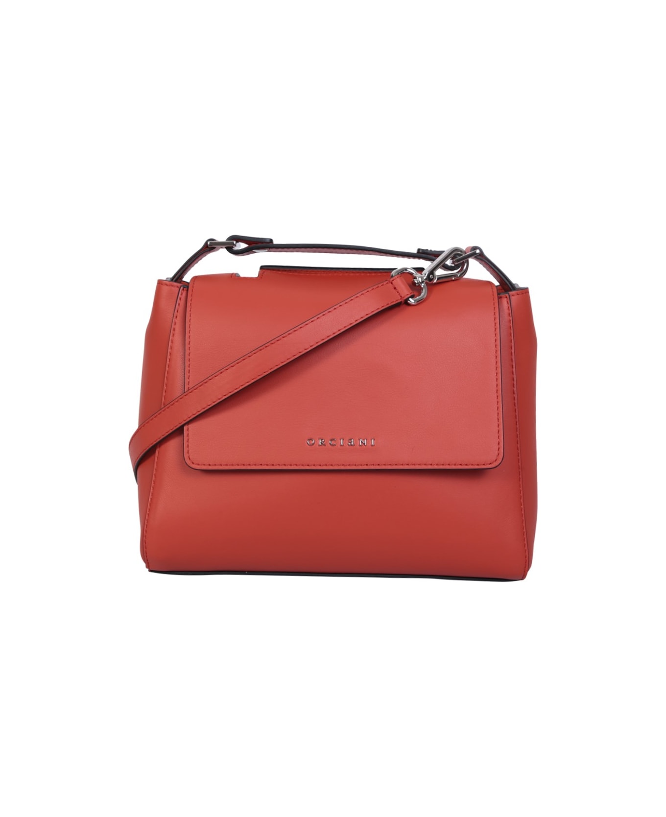 Foldover top. Magnetic fastening. Main compartment. Internal zip fastening pocket. Logo patch inside. Front logo. Single top handle. Adjustable detachable shoulder strap. Silver tone hardware. Color: orange