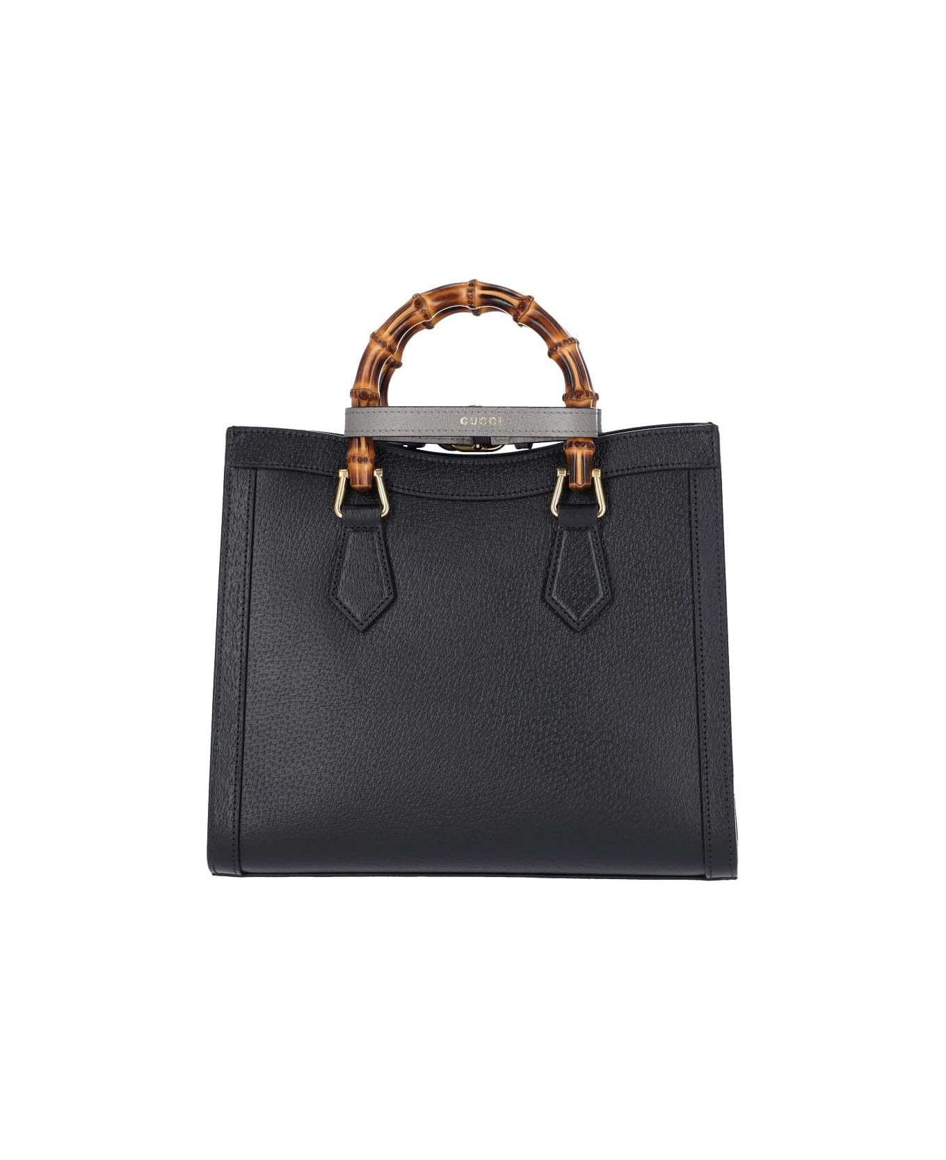Gucci 'Diana' small tote bag in black hammered leather with two rigid top bamboo handles, two decorative grey bands detail, gold logo print detail, adjustable and removable green and red web ribbon shoulder strap, adjustable and removable extra leather shoulder strap, golden 'Doppia G' metallic logo on the front, inner flat pocket, main inner compartment.