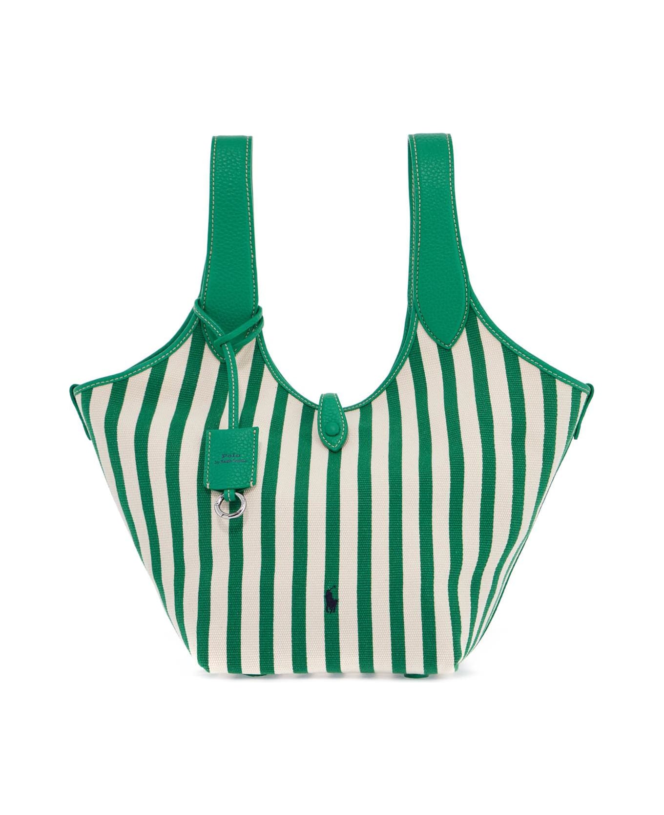 The Polo Ralph Lauren tote bag, from the Polo Play collection, is made of striped cotton canvas and finished with hammered leather. It features a double closure with a strap and snap button on one side and an anchor on the other. The top has two handles, while the interior is unlined and includes a removable keychain with a leather case. The design is detailed with the iconic pony embroidery on the front.