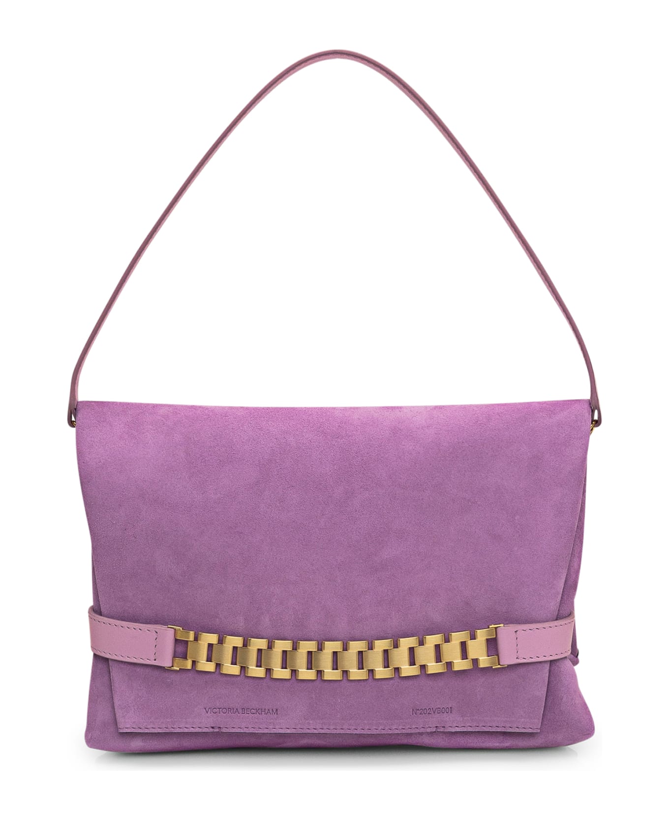 Purple suede bag. One handle. Flap closure. Chain on the front. Logo on the front.