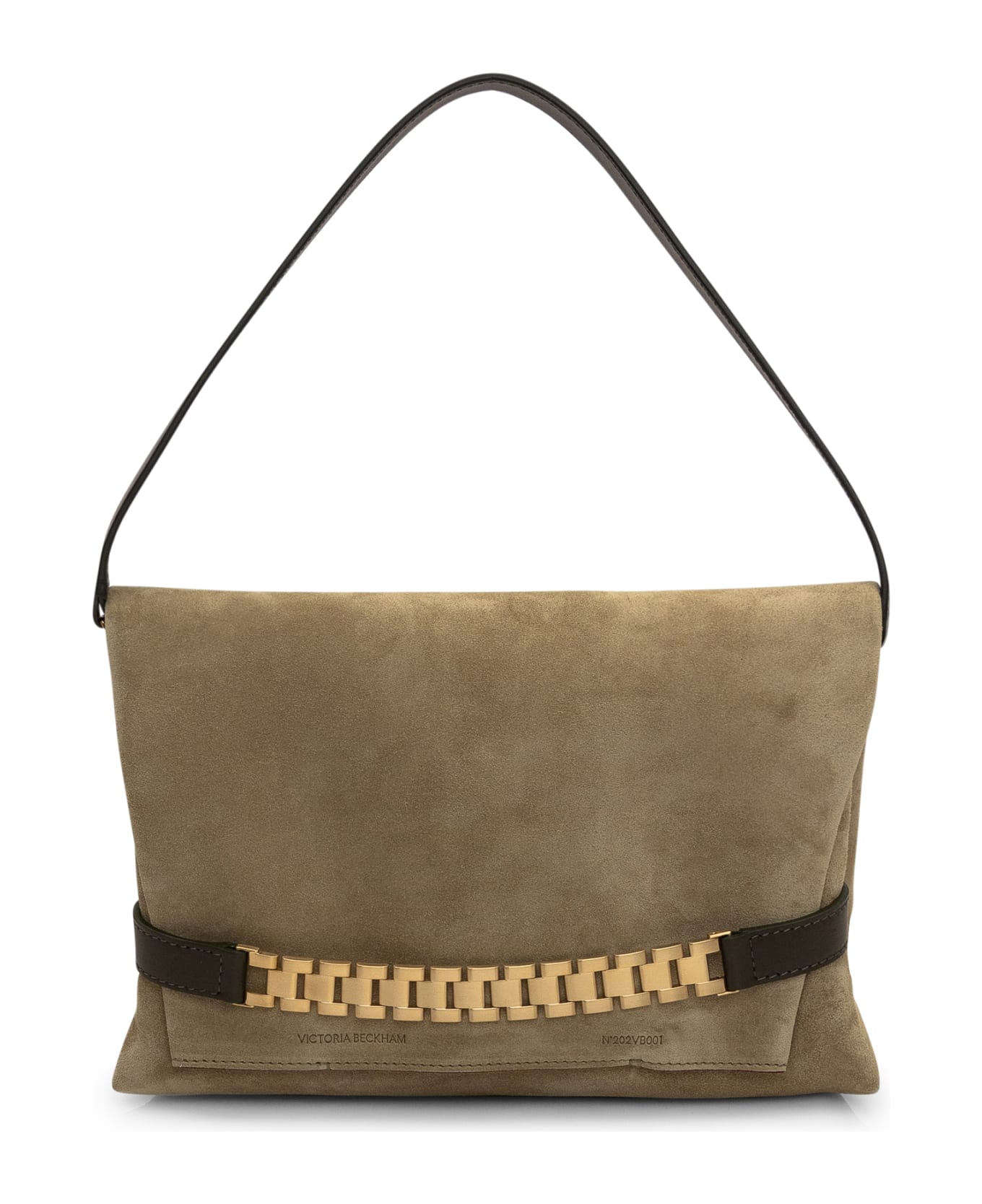 Green suede bag. One handle. Flap closure. Chain on the front. Logo on the front.