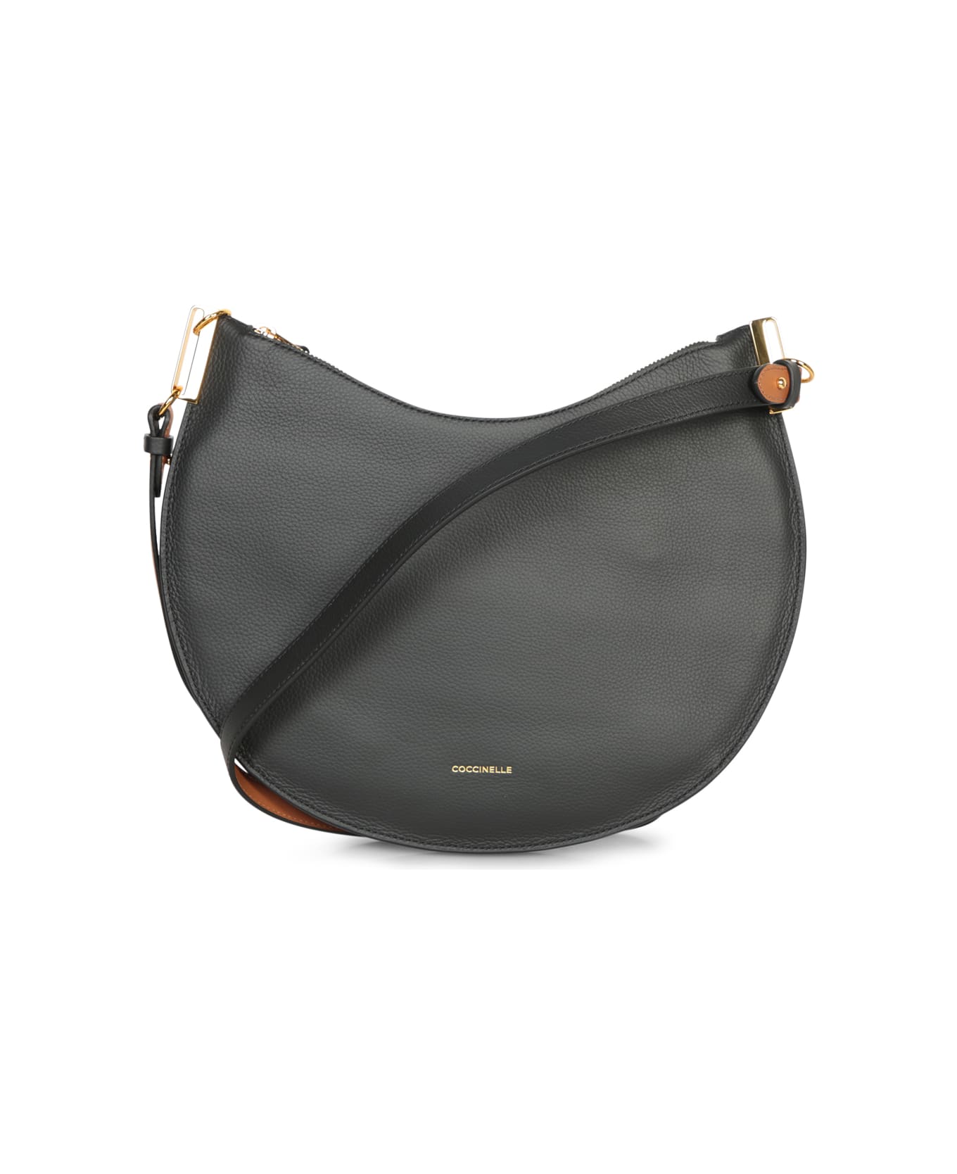 Elegant and versatile, the Coccinelle Sunup Hobo S black leather bag features a half-moon silhouette with gold-tone metal fittings that add a luxurious touch. Comes with an adjustable shoulder strap for daily use.