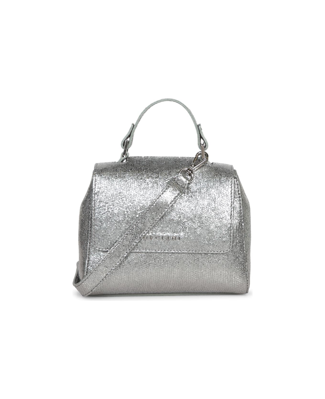 A fusion of luxury and practicality, this Sveva Mini Light bag by Orciani in shimmering silver features a versatile shoulder strap and a sleek leather handle, perfect for any occasion.
