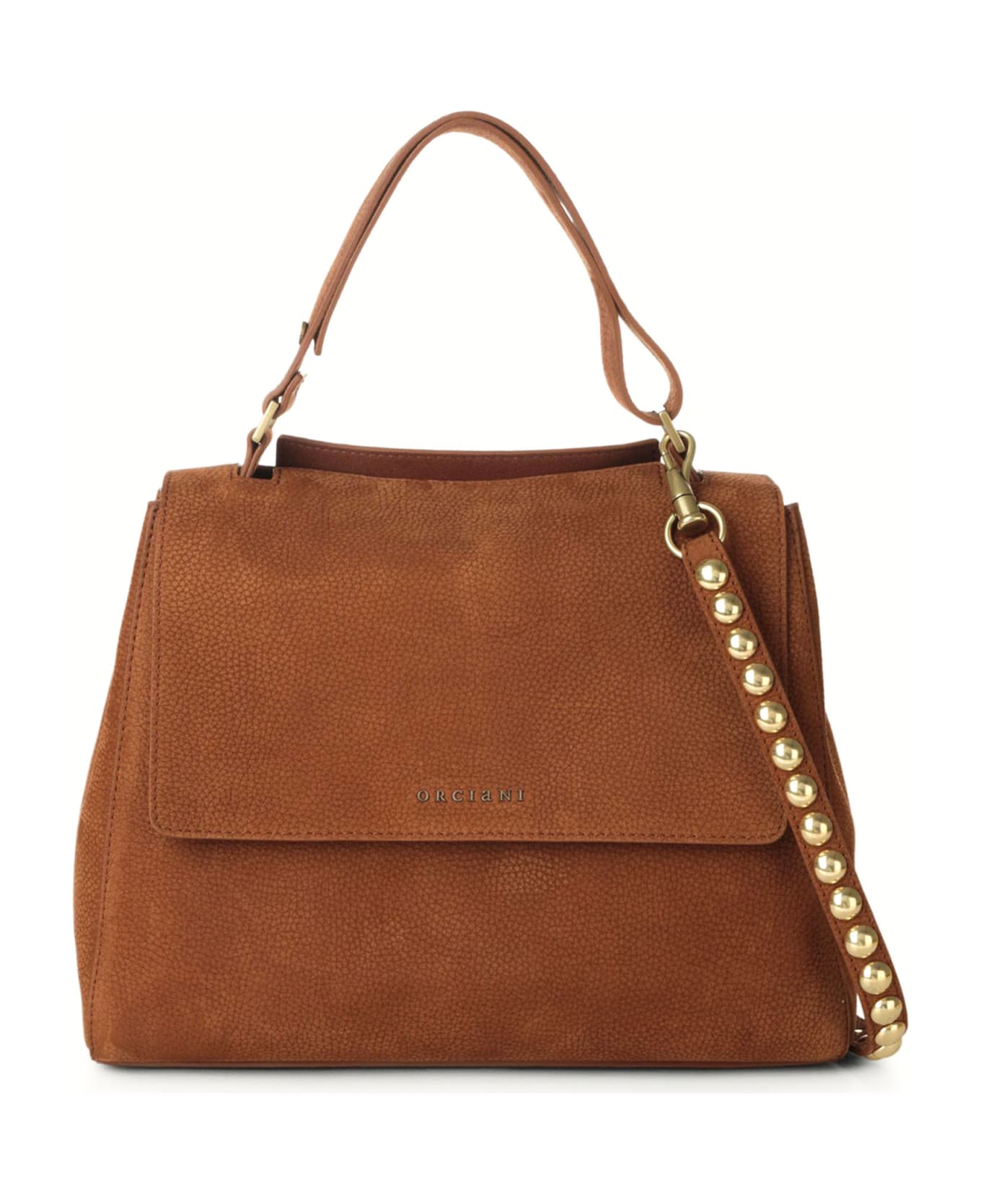 Sveva Nabucco Ball Medium leather handbag, 3 pockets interiors, one of which is zippered, magnetic closure and flap, removable strap whit studs and additional removable adjustable shoulder strap, golden brass finish, width: 32 cm, height: 24 cm, depth: 15 cm