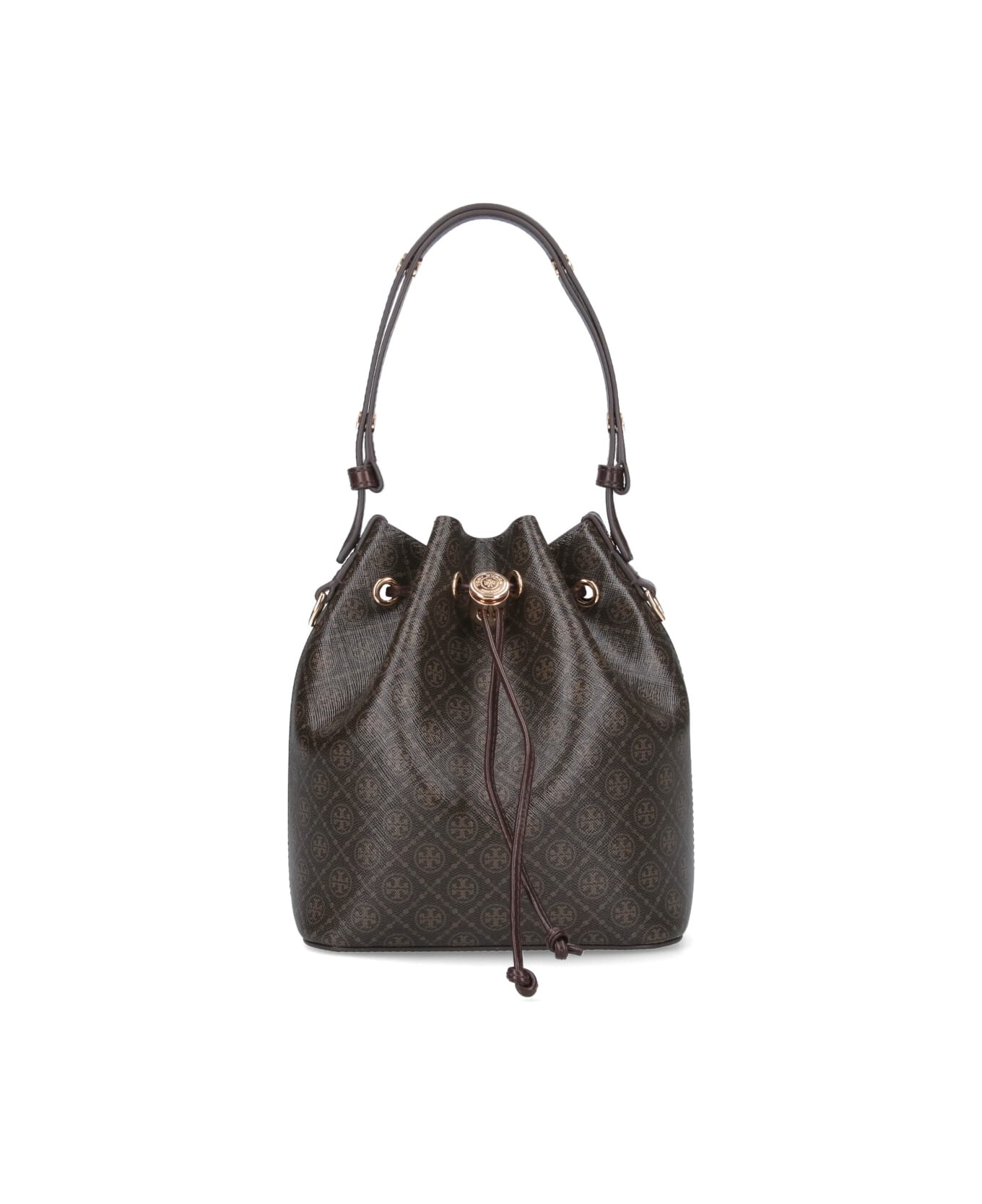 Tory Burch 'T Monogram' brown canvas bucket bag with logo pattern, leather trims, adjustable handle, adjustable and removable shoulder strap, drawstring closure, gold metal logo charm detail, removable inner zip pocket, single inner compartment.