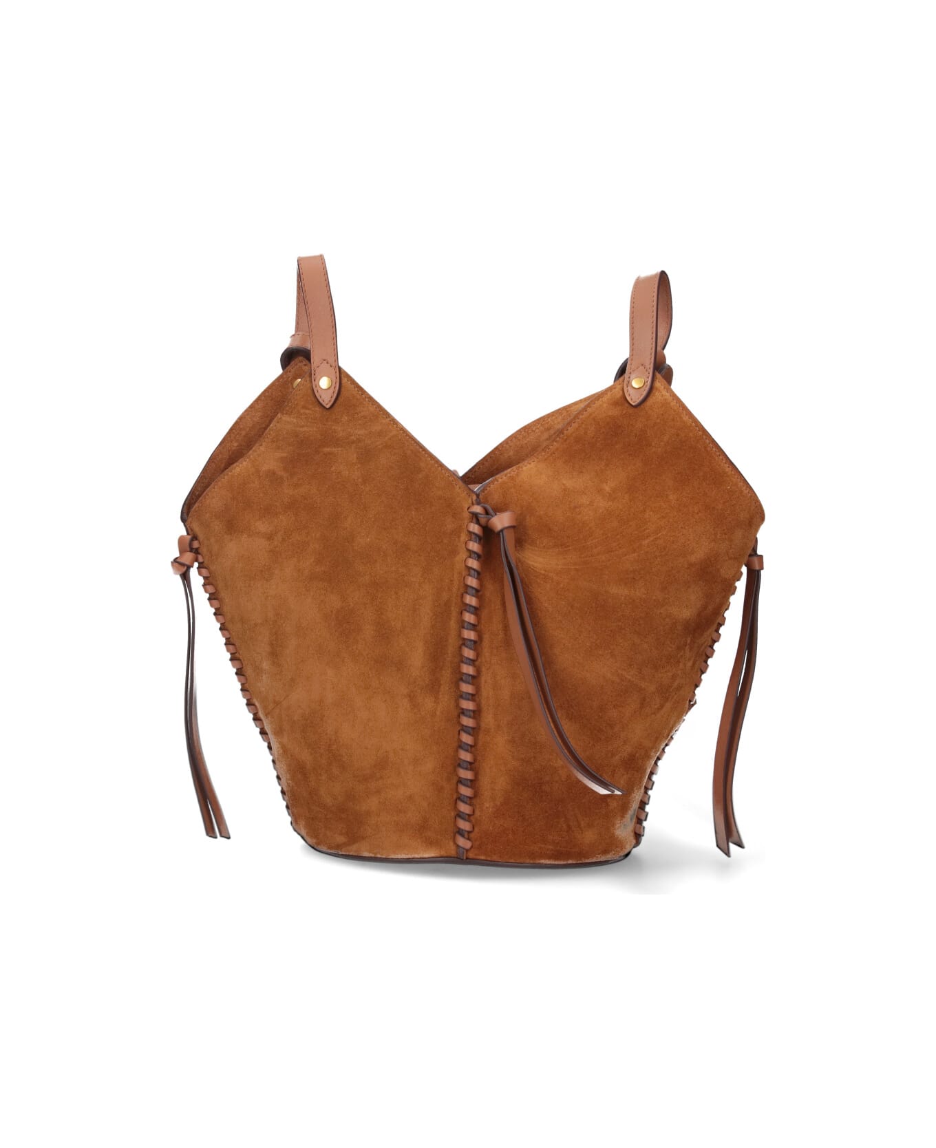 Isabel Marant 'Tampa' bucket bag in brown suede calf leather with all-over woven details, adjustable shoulder strap, knotted leather lace closure, gold logo embossed on the back, inner slip pocket, single inner compartment.