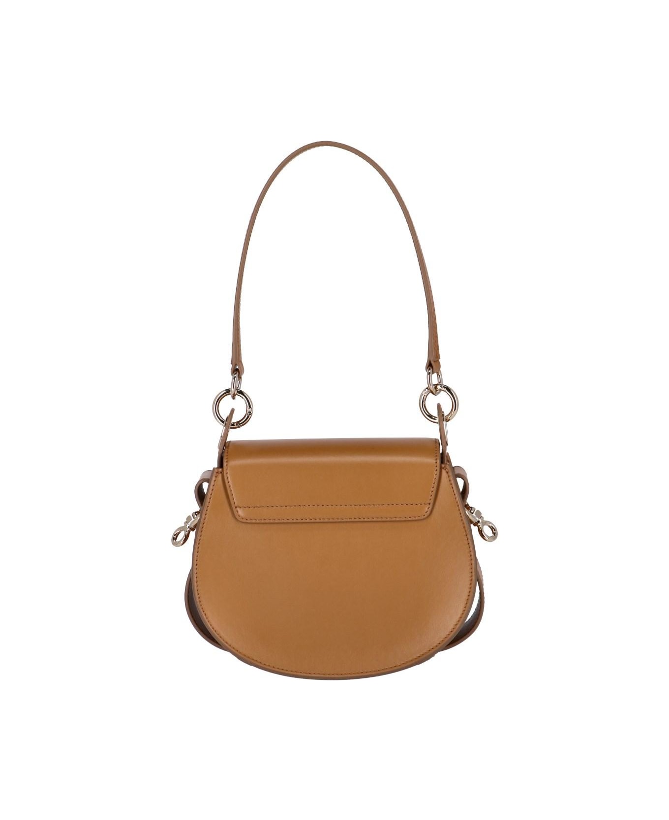 Chlo mall Tess handbag in brown leather with removable top handle, removable and adjustable shoulder strap, front iconic metal O ring, magnetic button closure, interior front flat pocket, interior main compartment, and silver metal hardware.