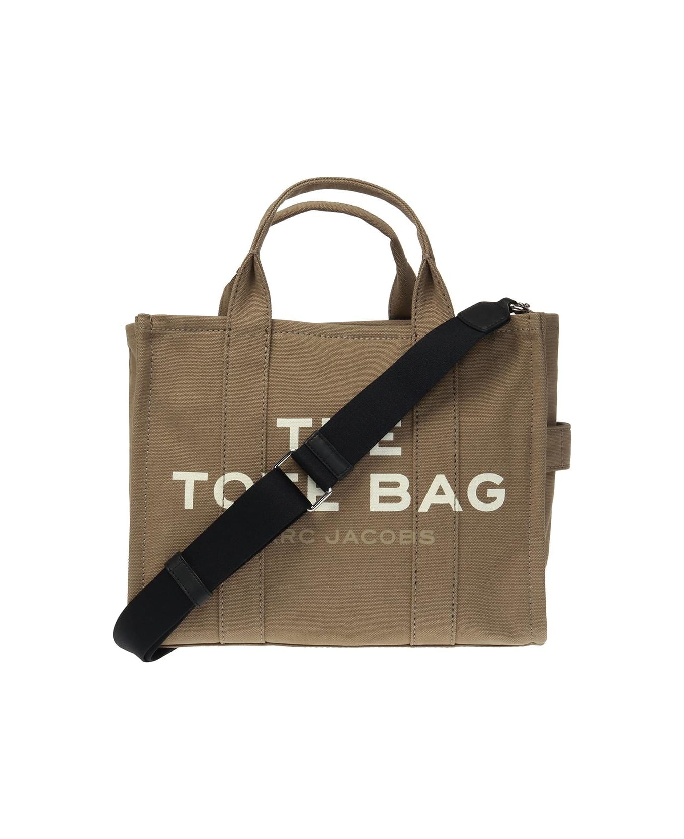 Green 'The Traveler Tote' bag from The Marc Jacobs. Size mini. Made of canvas. Zip fastening. Decorated with a logo print in white and green. Two half-round handles. Detachable, adjustable shoulder strap in black. Main internal compartment with two slip p