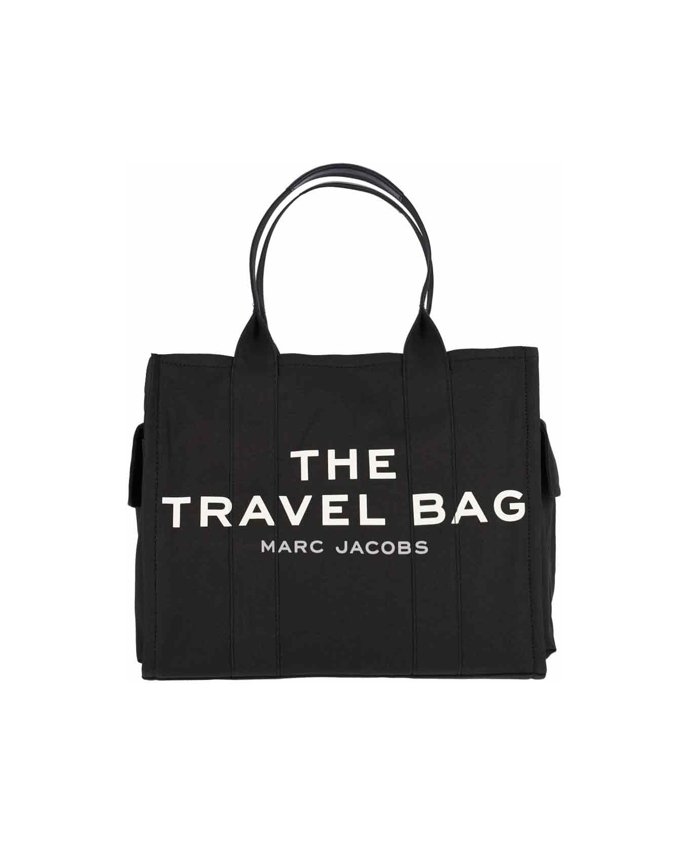 Marc Jacobs "The Travel Bag" black cotton tote bag with two handles, adjustable and removable shoulder strap, zip closure, tone-on-tone logo jacquard on the front, two side flat pockets, one flat back pocket, back logo patch, one single inner compartment.