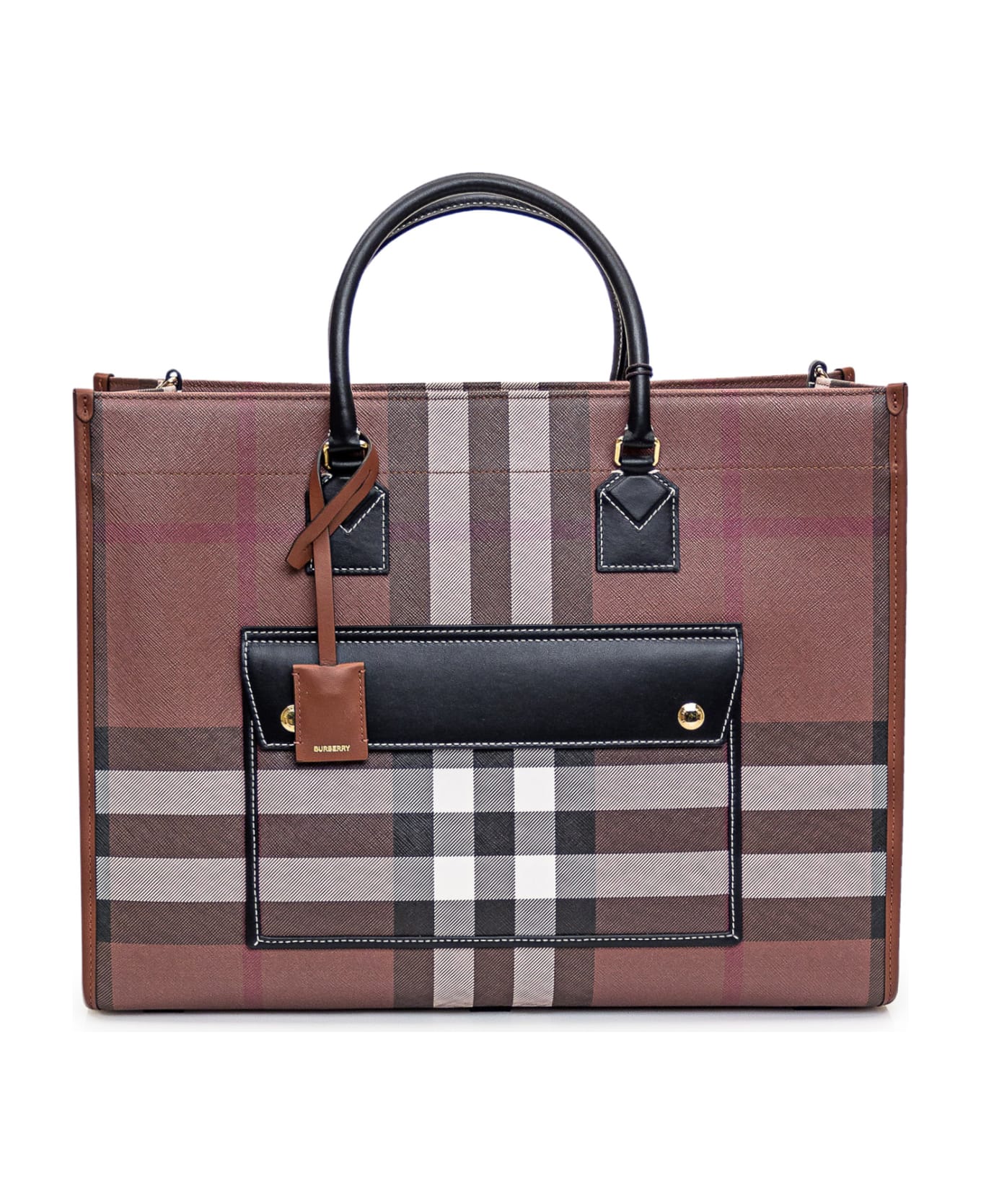 Brown Tote bag with Burberry Check checkered pattern. Two handles. Removable and adjustable shoulder strap. Inside zip pocket. Snap button closure. External pocket with buttons. Adresse door plate with logo.