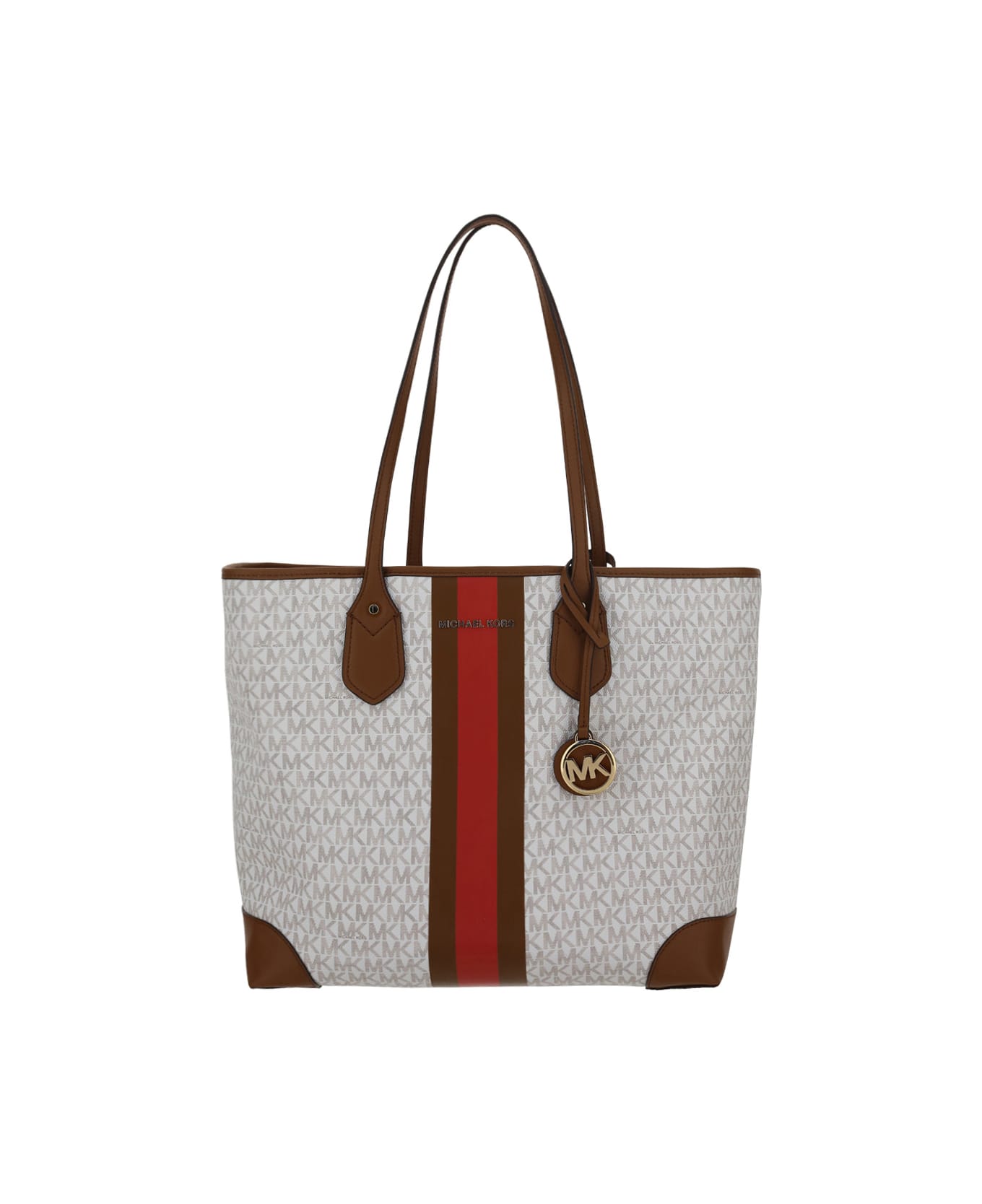 Tote bag by michael kors, iconic all-over repeated brand monogram design, multicolored bands on front and back, dangling brand logo detail on front, iconic signature embossed applique on front, double stiff handle, removable all-over repeated brand logo patterned pouch with button for closure, interior welt pocket.