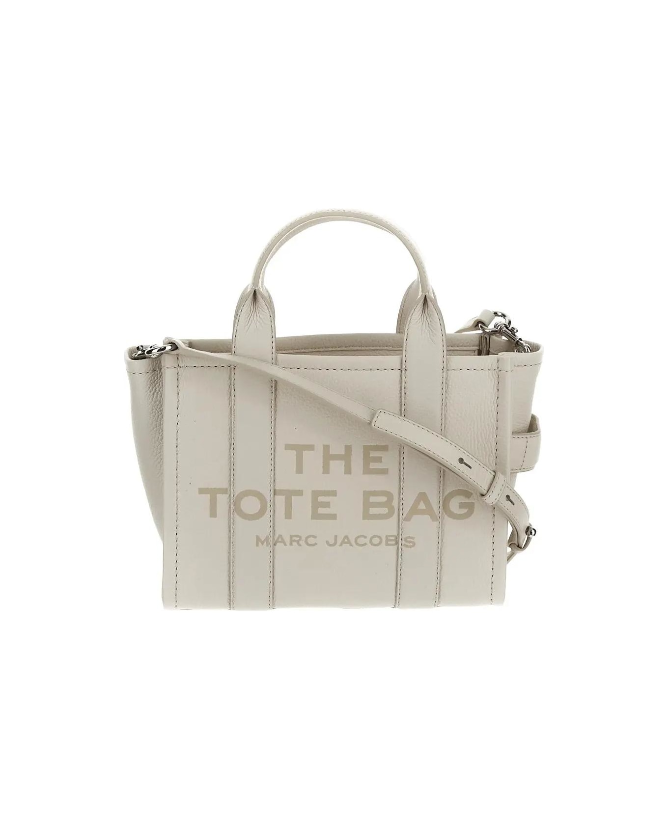 Marc Jacobs tote bag in ivory grain leather with one compartment, top-zip closure, twin top handle extended to the bottom, adjustable and removable leather shoulder strap, debossed logo patch at the back, debossed tonal logo at front and silver-toned metal hardware.