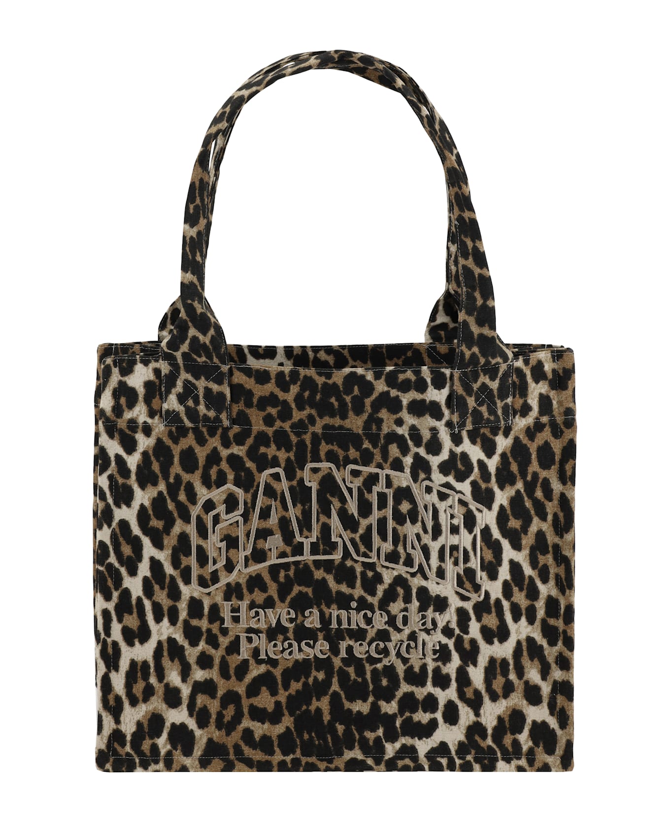 Cotton tote bag by ganni, two top tubular handles, print with contrasting iconic brand monogram detail on front, animal pattern, single interior compartment. Composition: 100% % Cotton