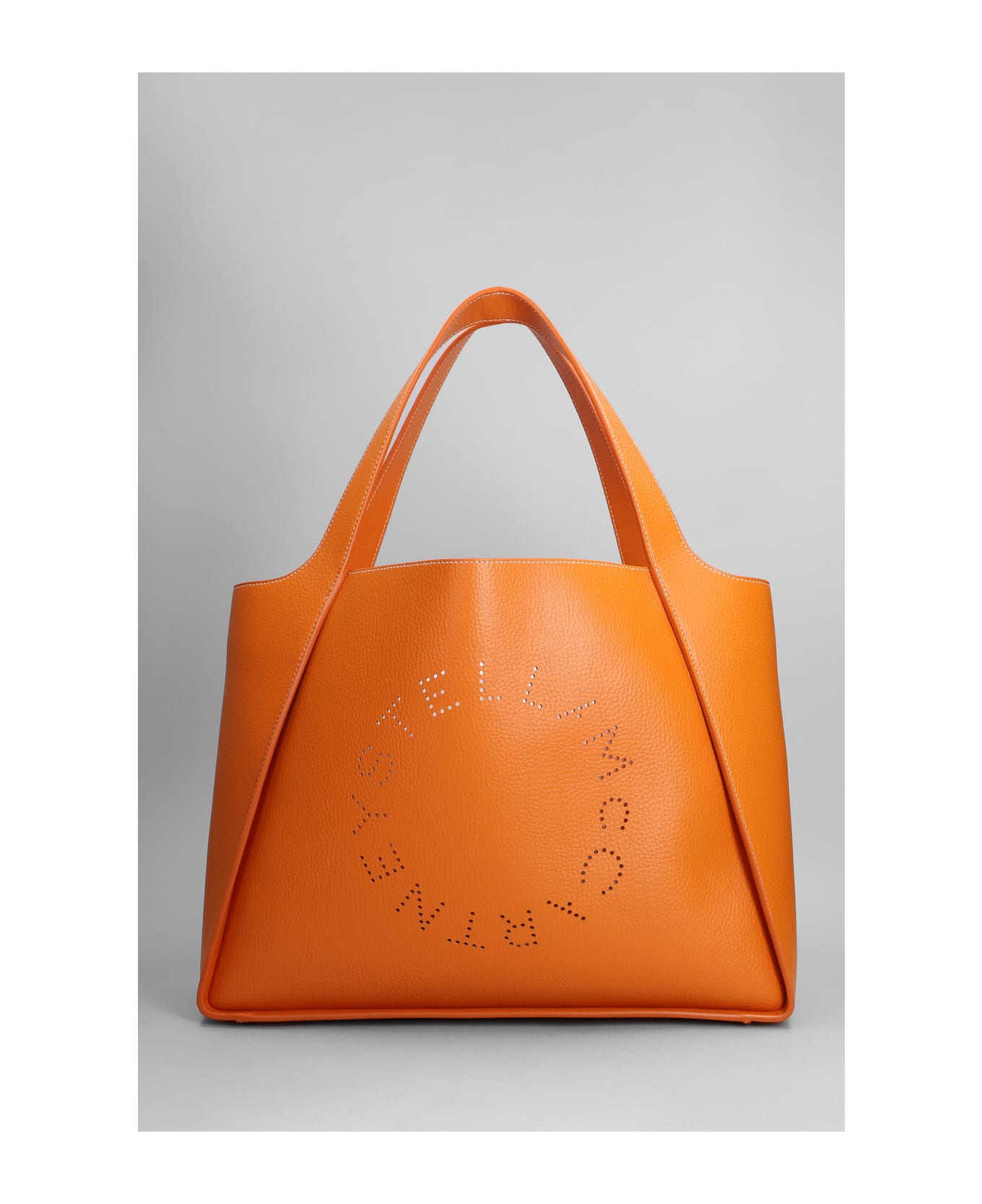 Tote in orange faux leather, double handle, internal removable pochette, Height 305 mm, Width 390 mm, perfored logo, 100% artificial leather, Made in Italy