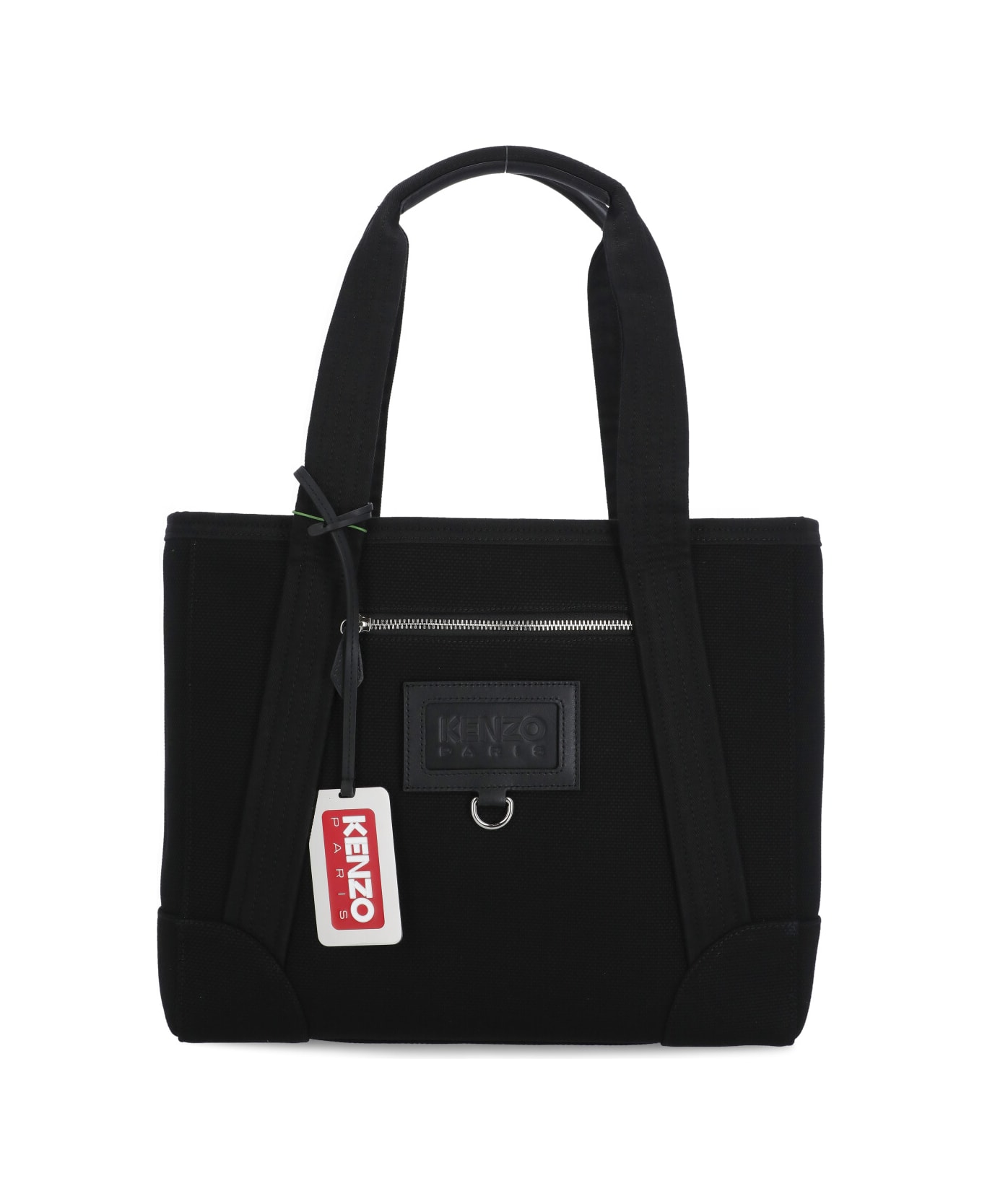 - Black Kenzo cotton shopping bag for woman - Included metal charm - Front Kenzo tab with keyring - One front welt pocket with zip fastening - One main compartment with zip fastening - One rear welt pocket - Two internal welt pockets